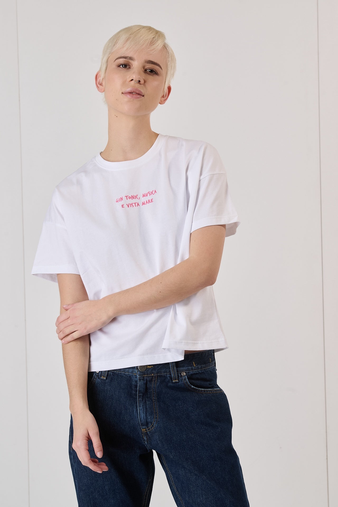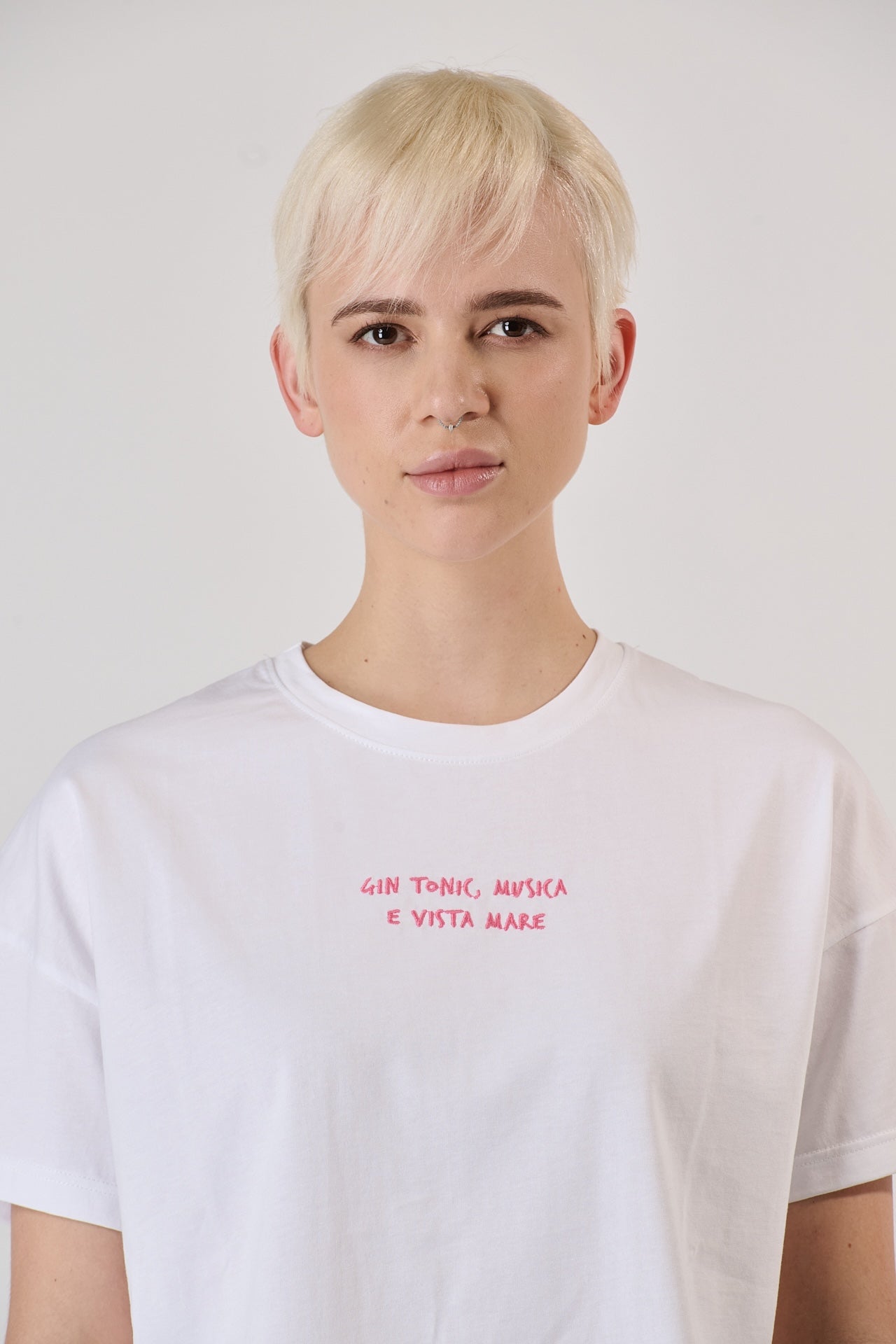 T-shirt Bianca con Ricamo Gin Tonic, Musica e Vista Mare