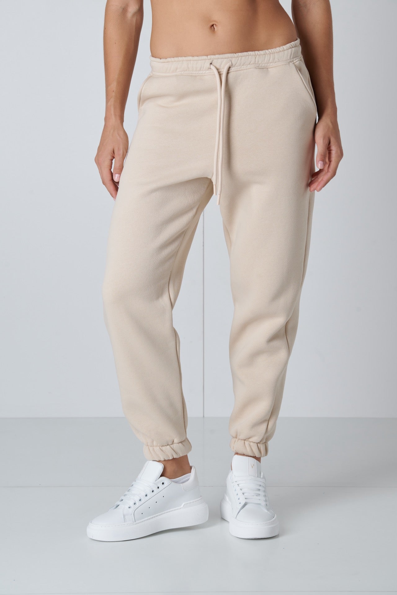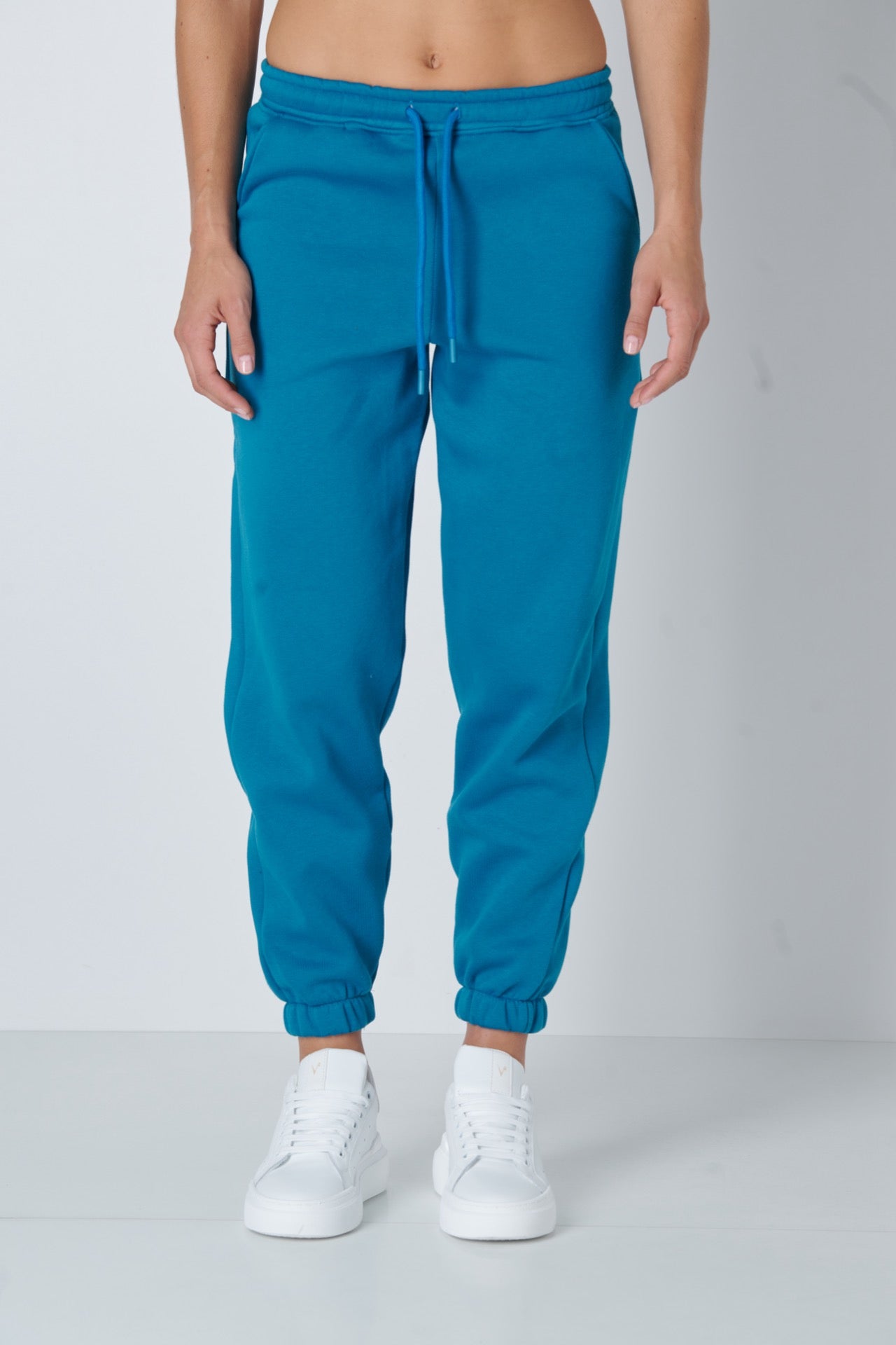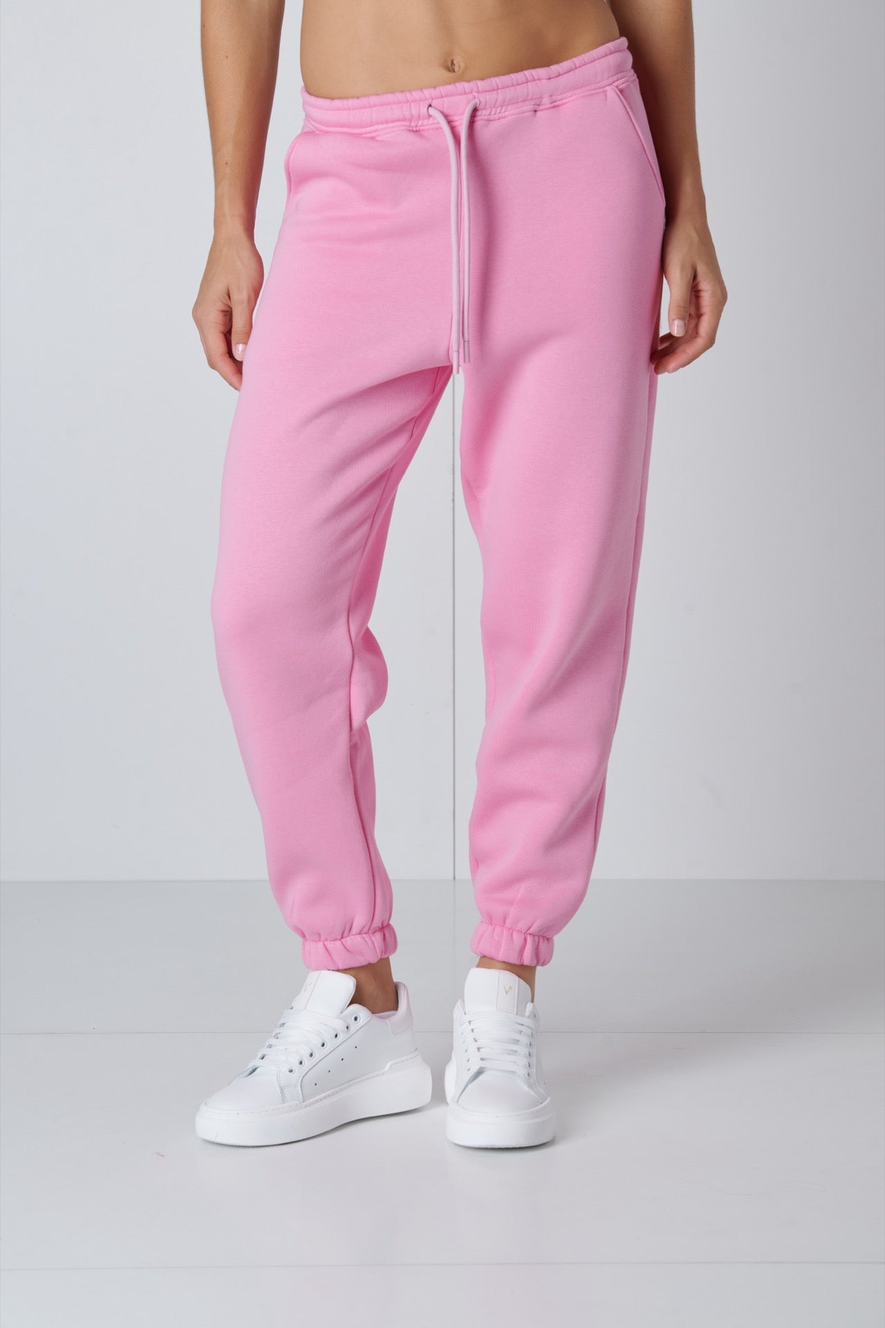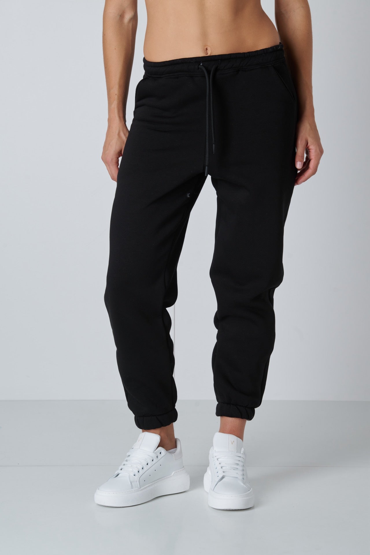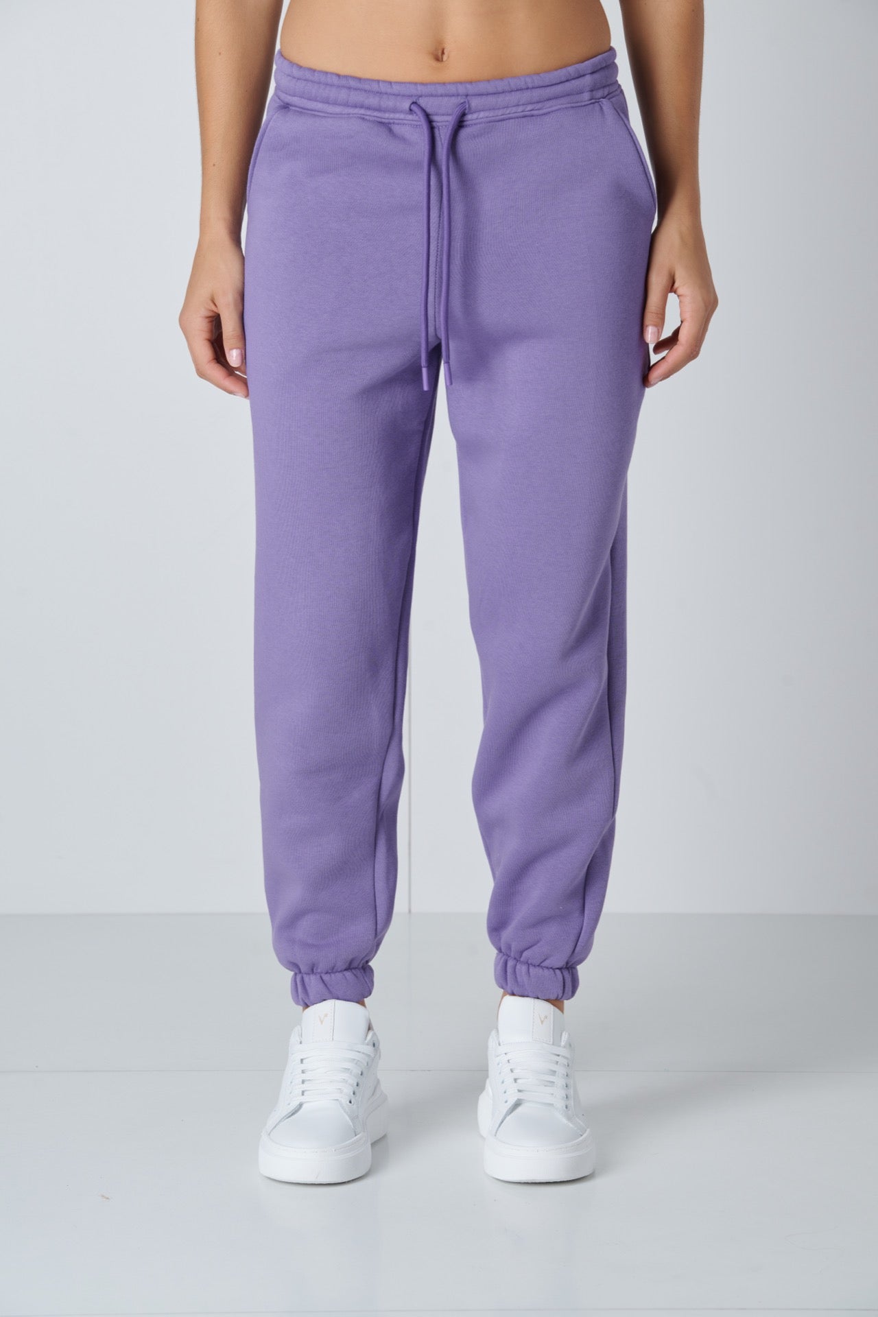 Pantalone in felpa con elastico in vita, due tasche laterali, tasca posteriore ed elastici alle caviglie.
