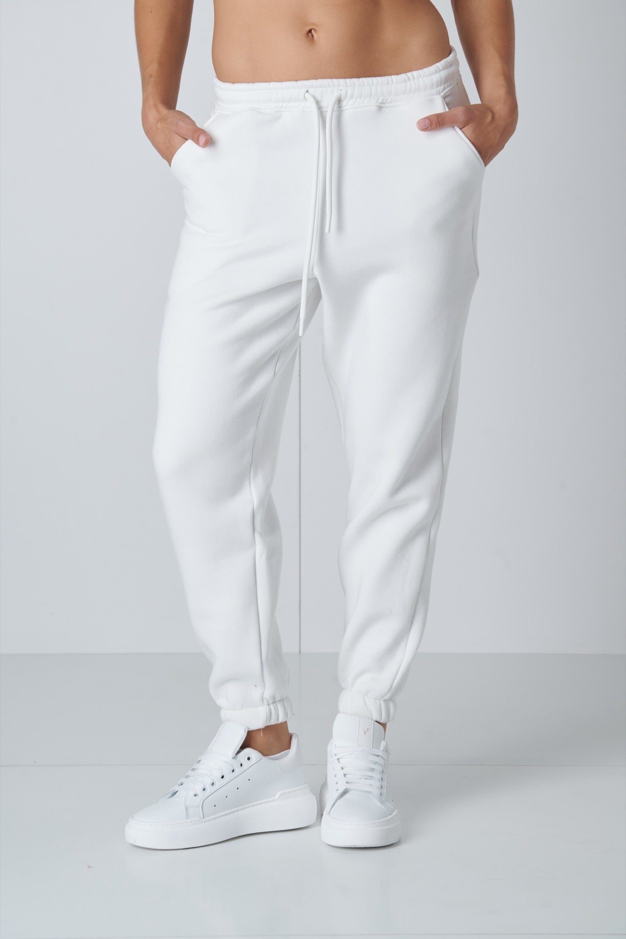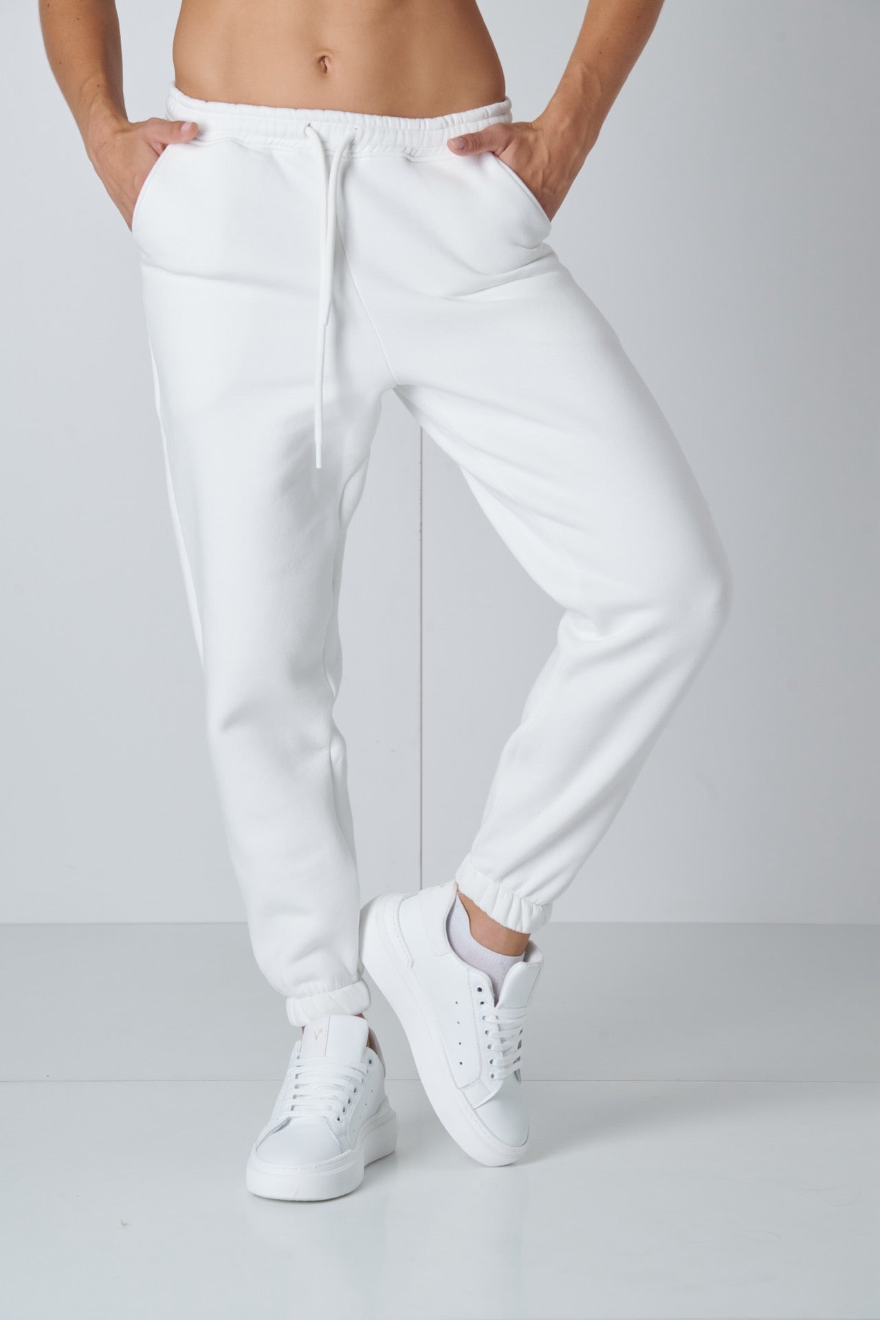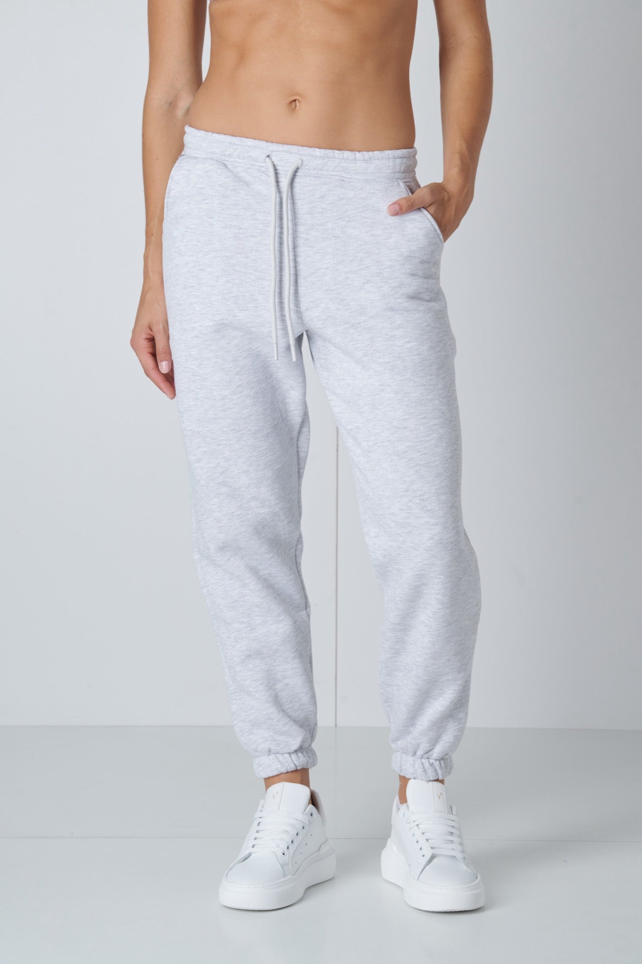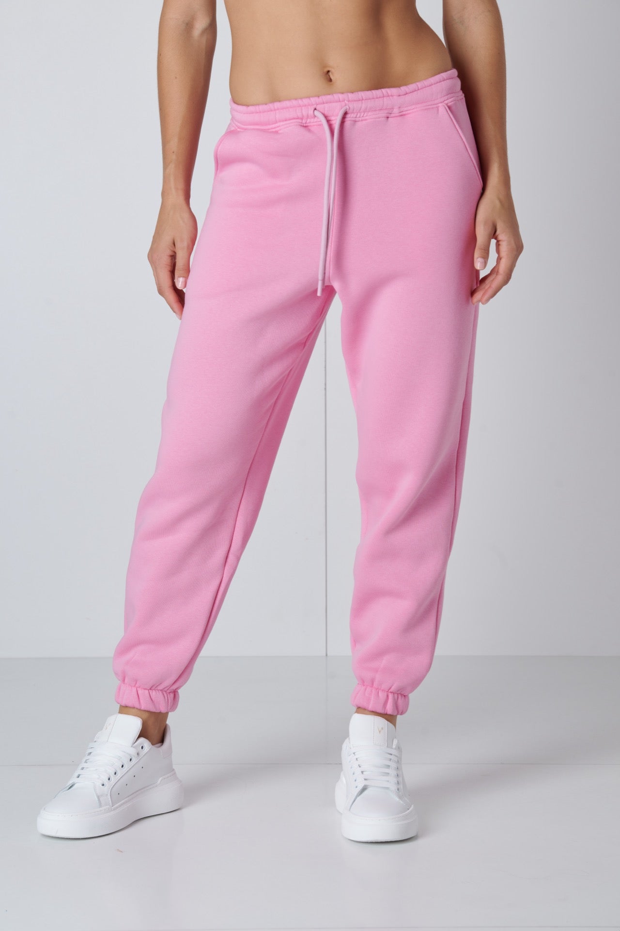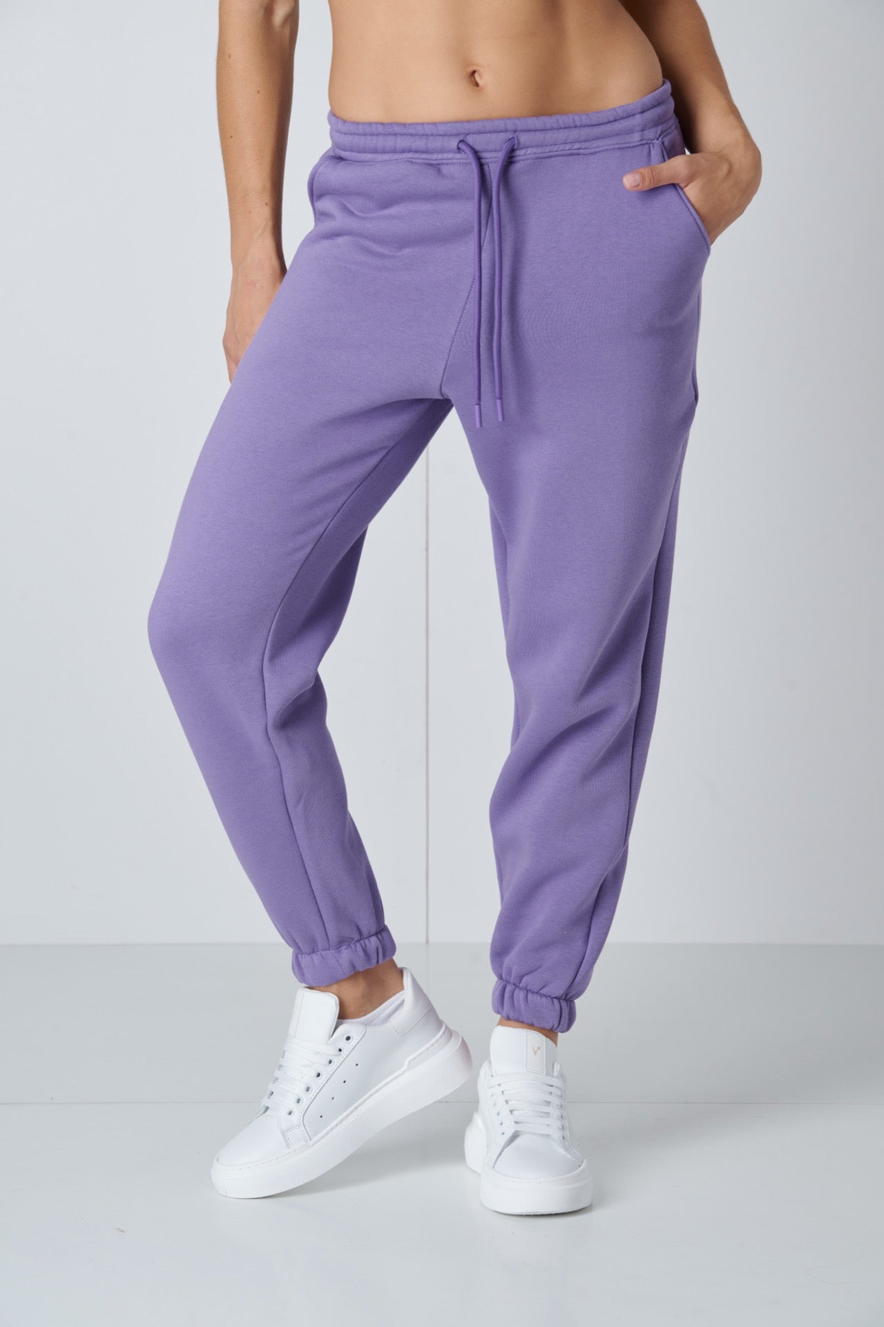 Pantalone in felpa con elastico in vita, due tasche laterali, tasca posteriore ed elastici alle caviglie.