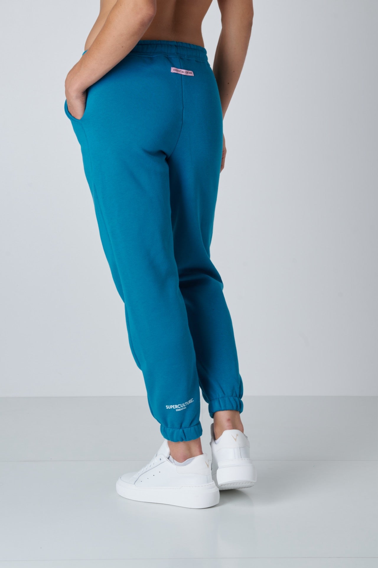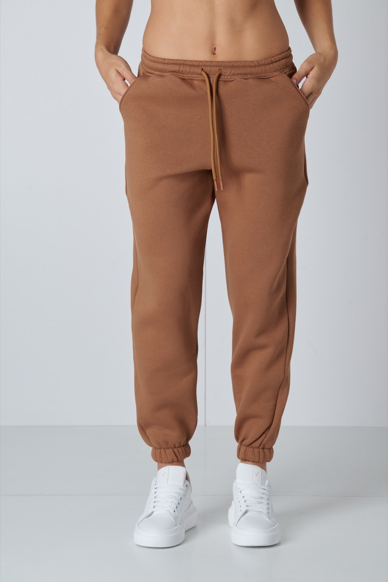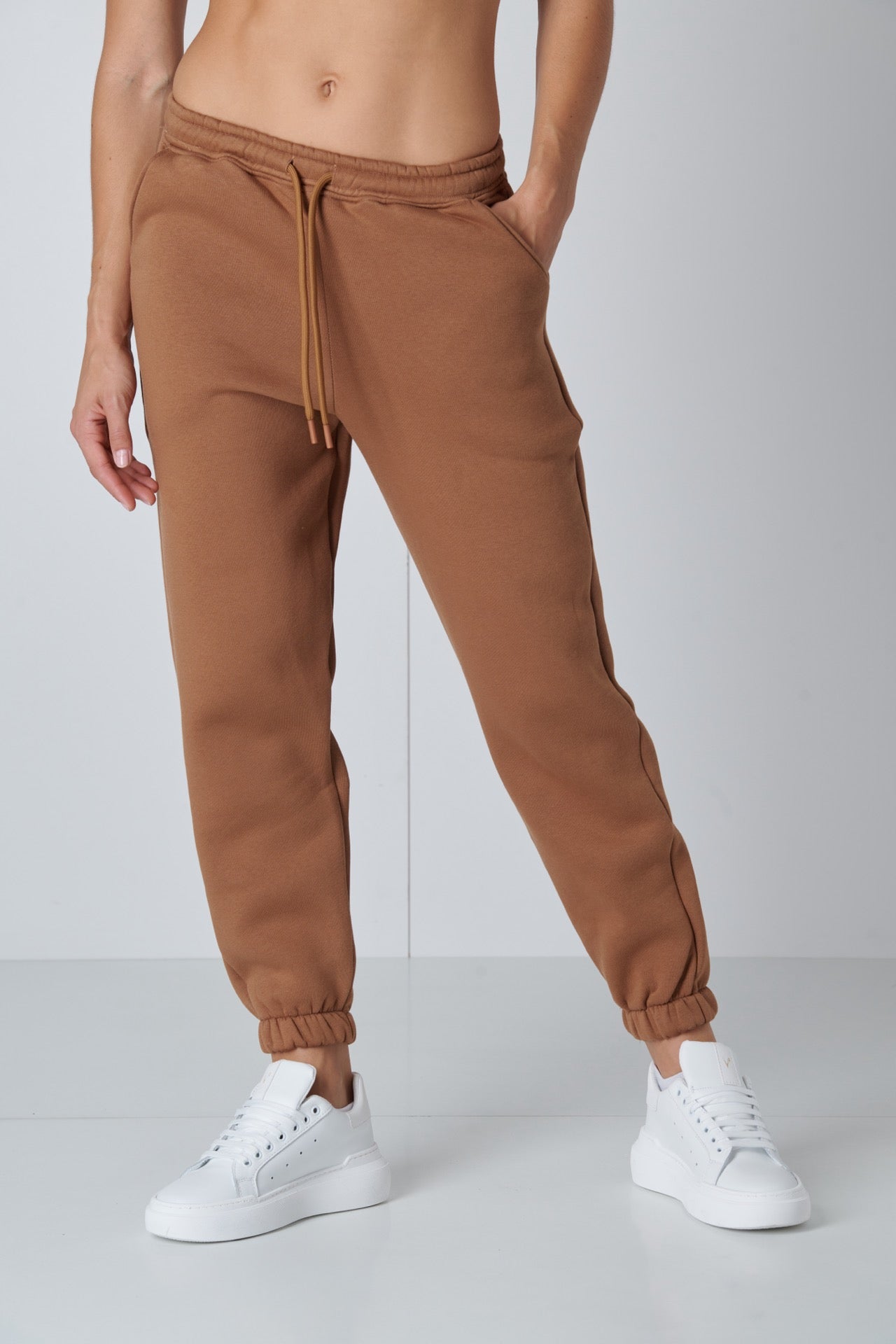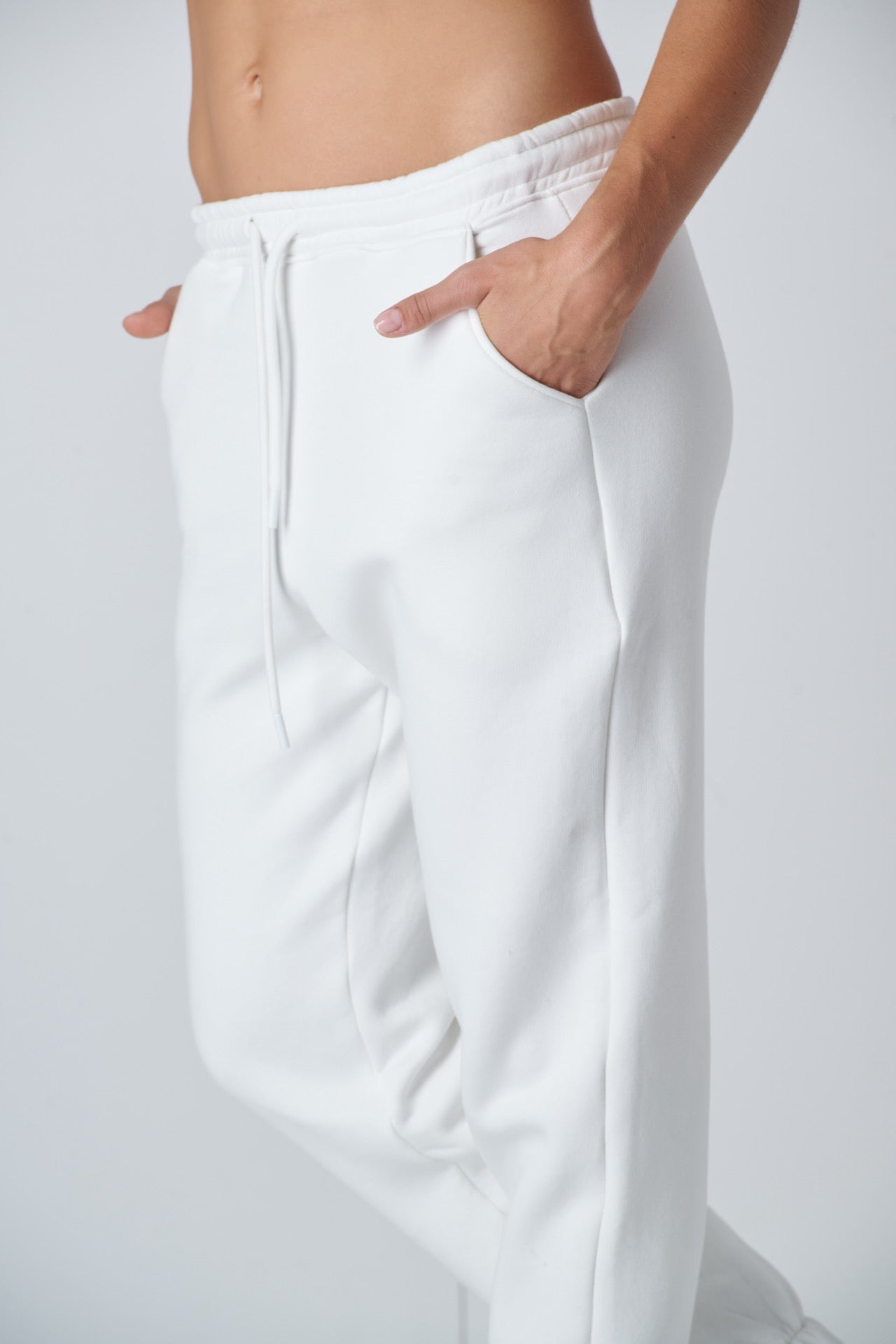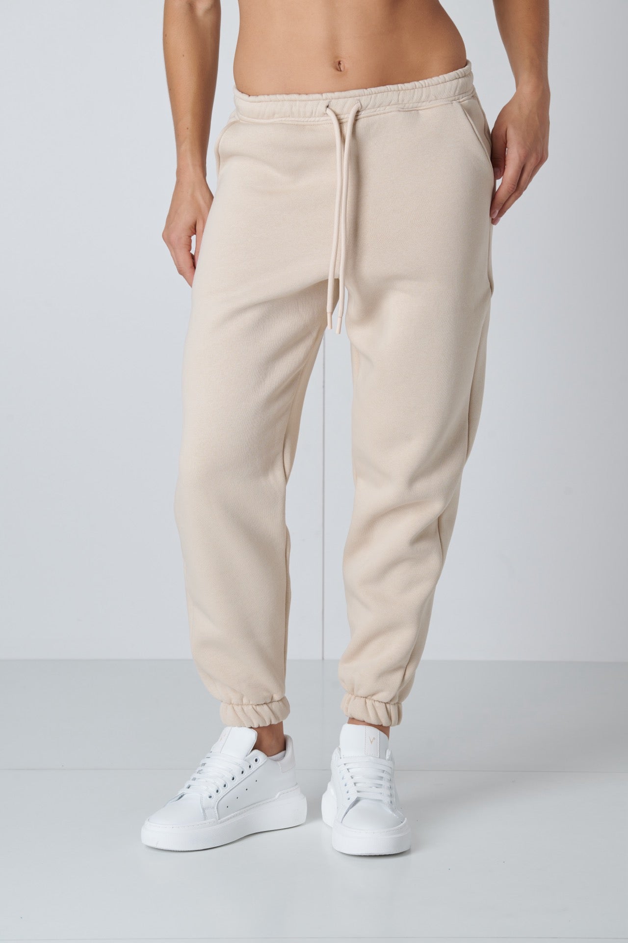 Pantalone in felpa con elastico in vita, due tasche laterali, tasca posteriore ed elastici alle caviglie.