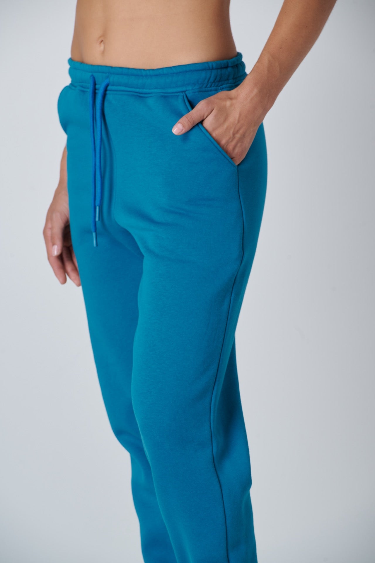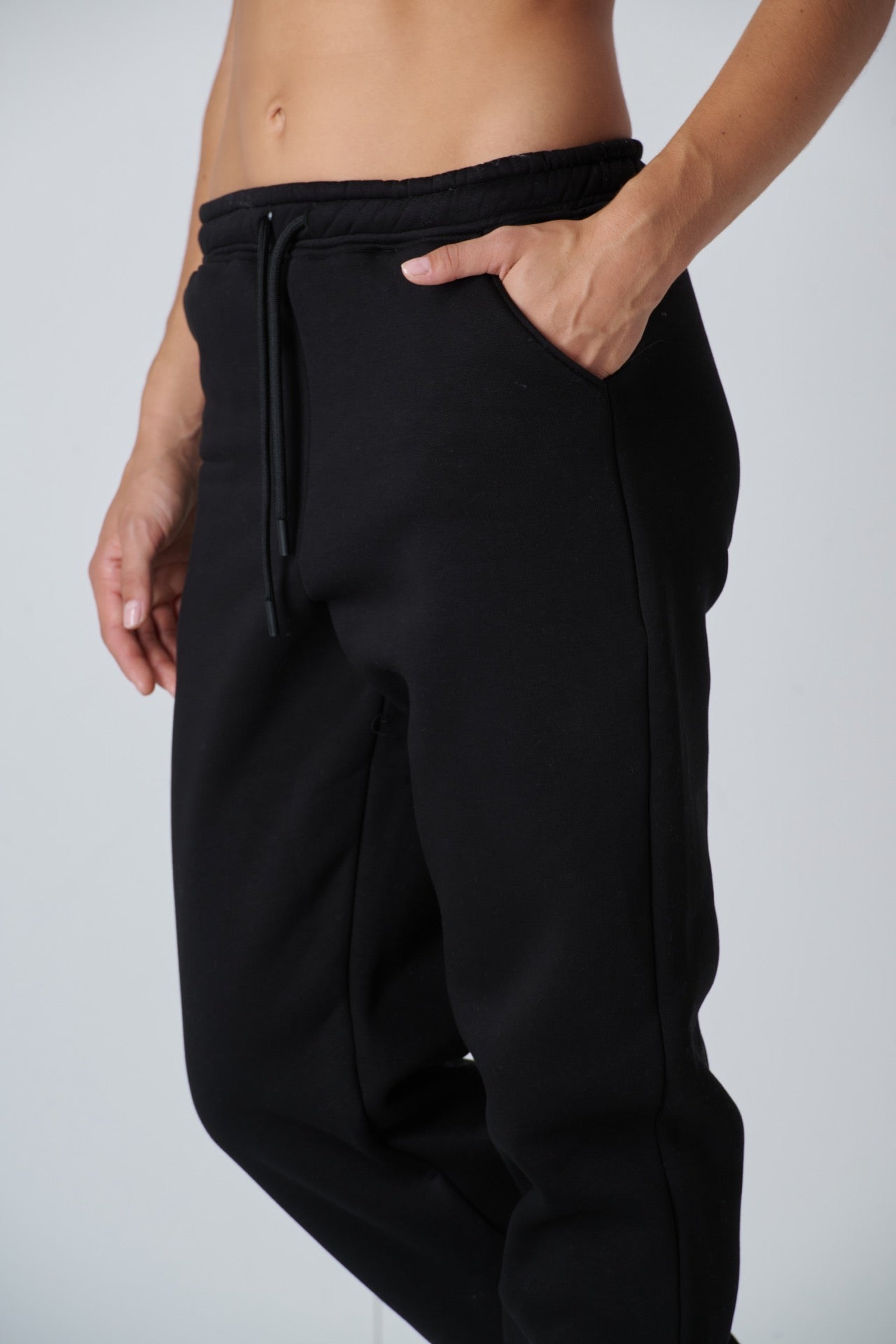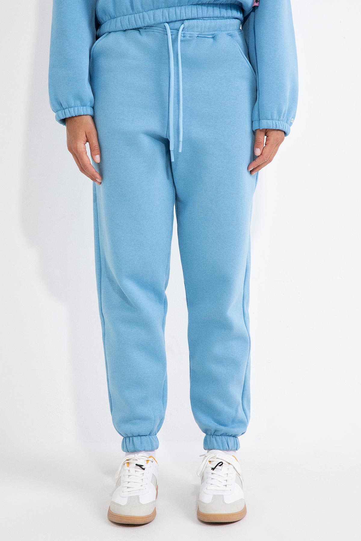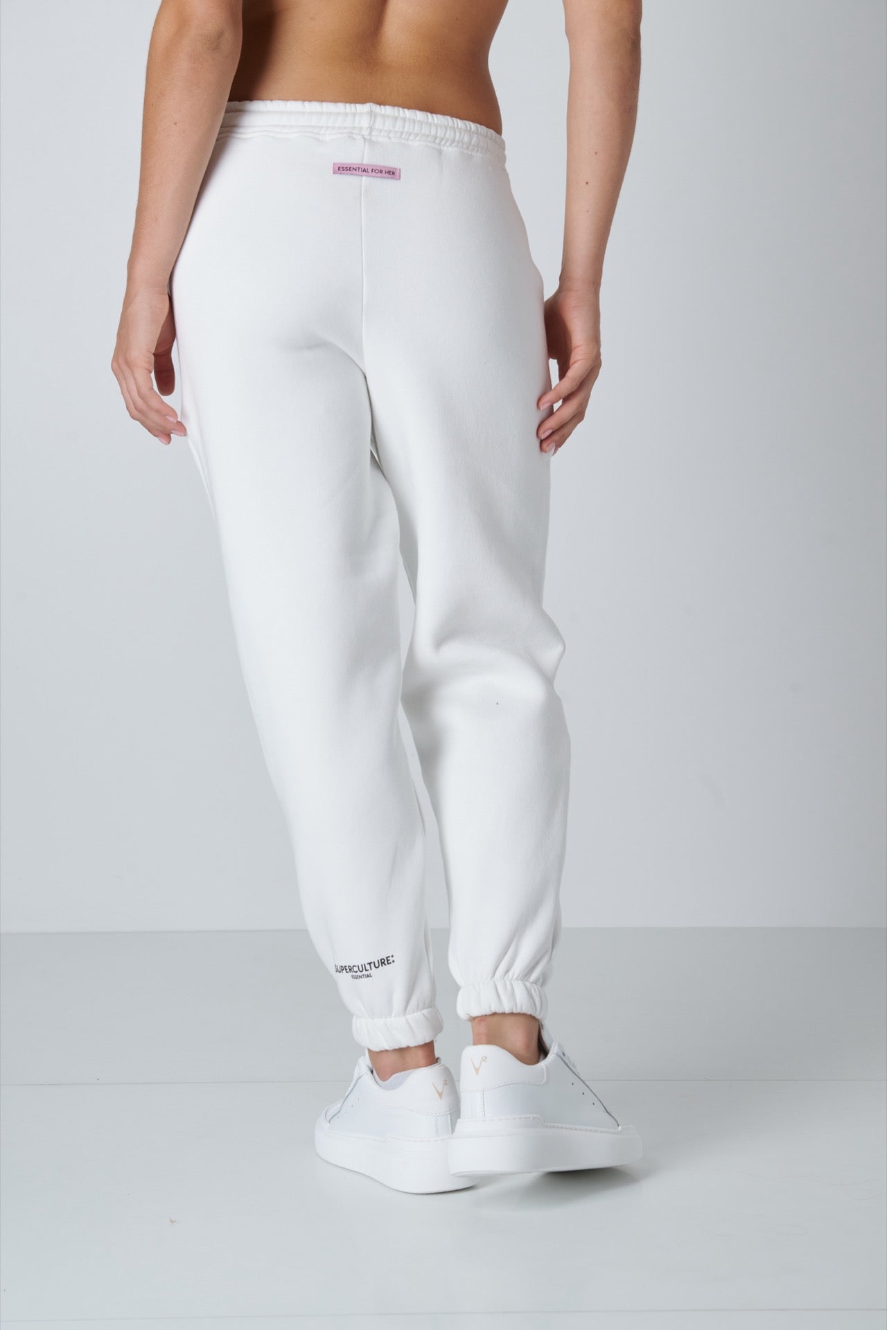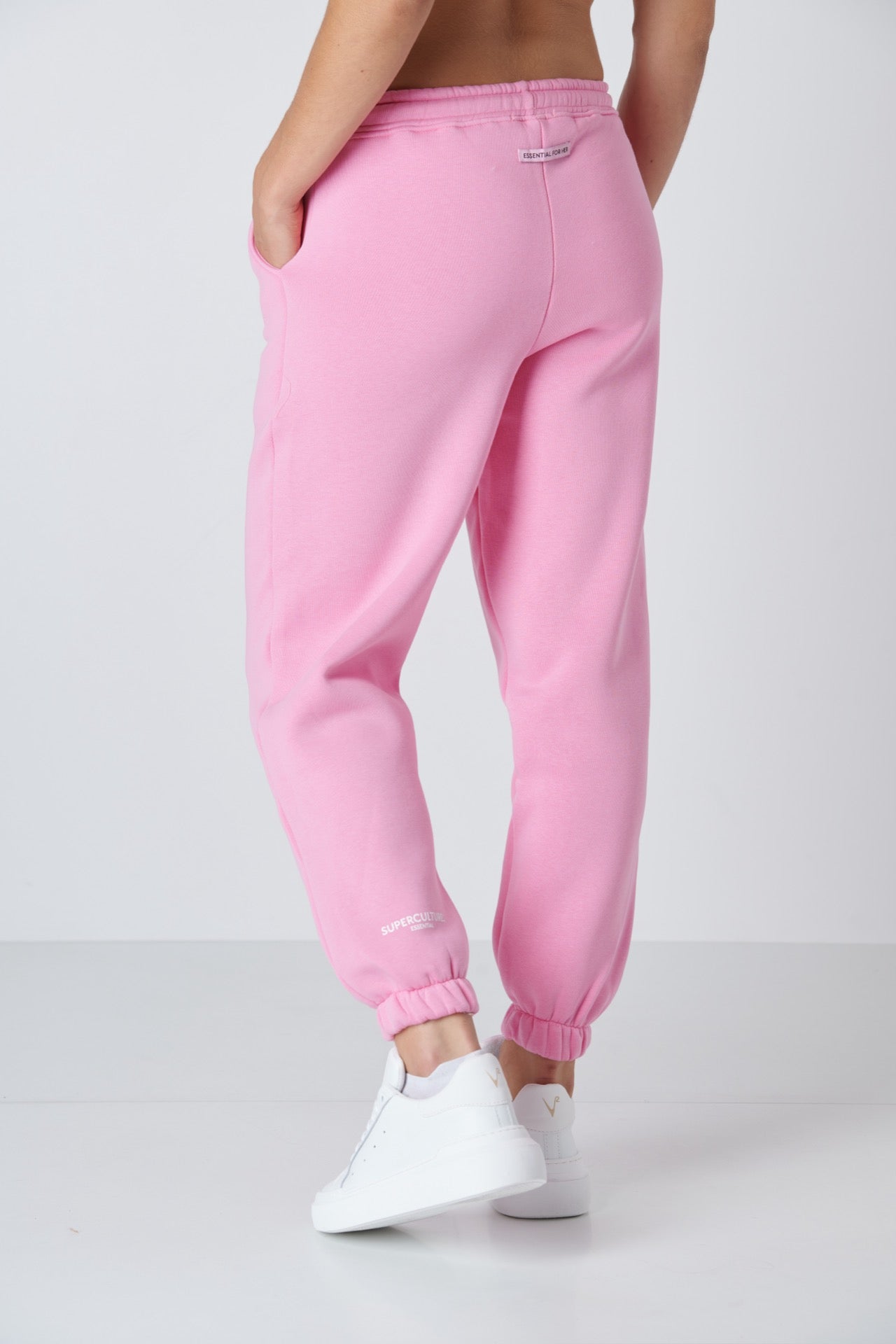 Pantalone in felpa con elastico in vita, due tasche laterali, tasca posteriore ed elastici alle caviglie.