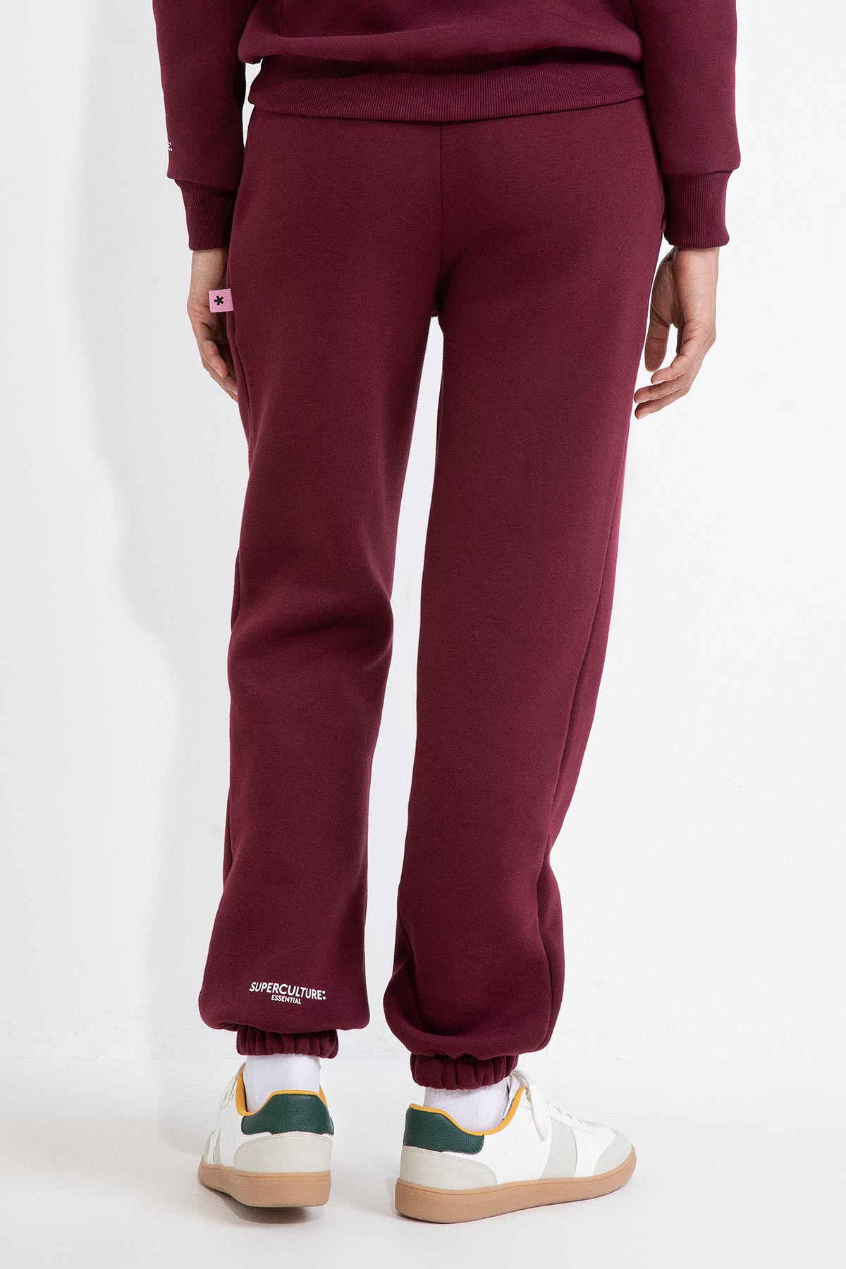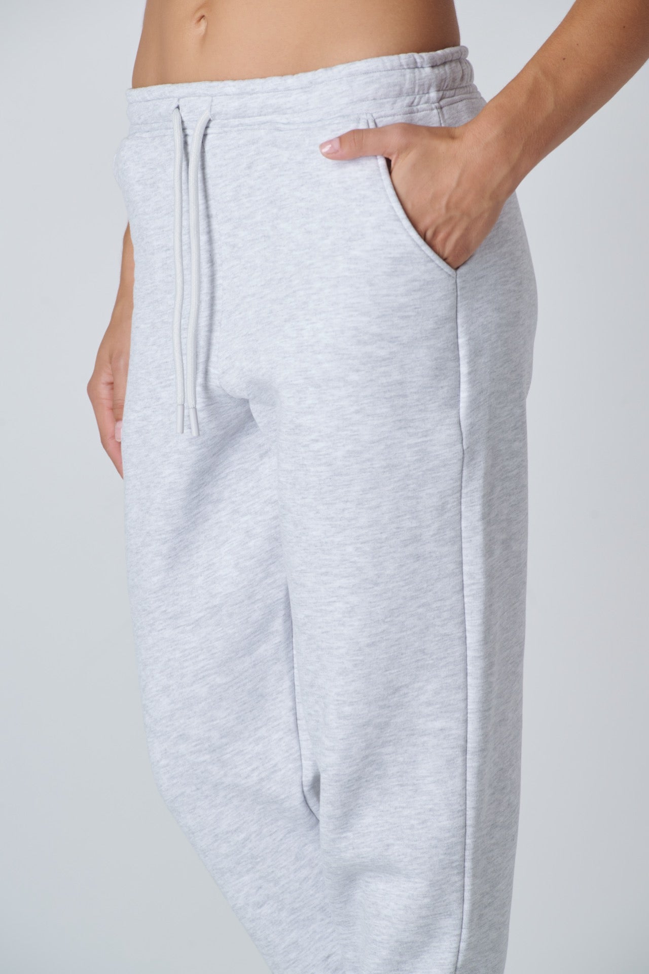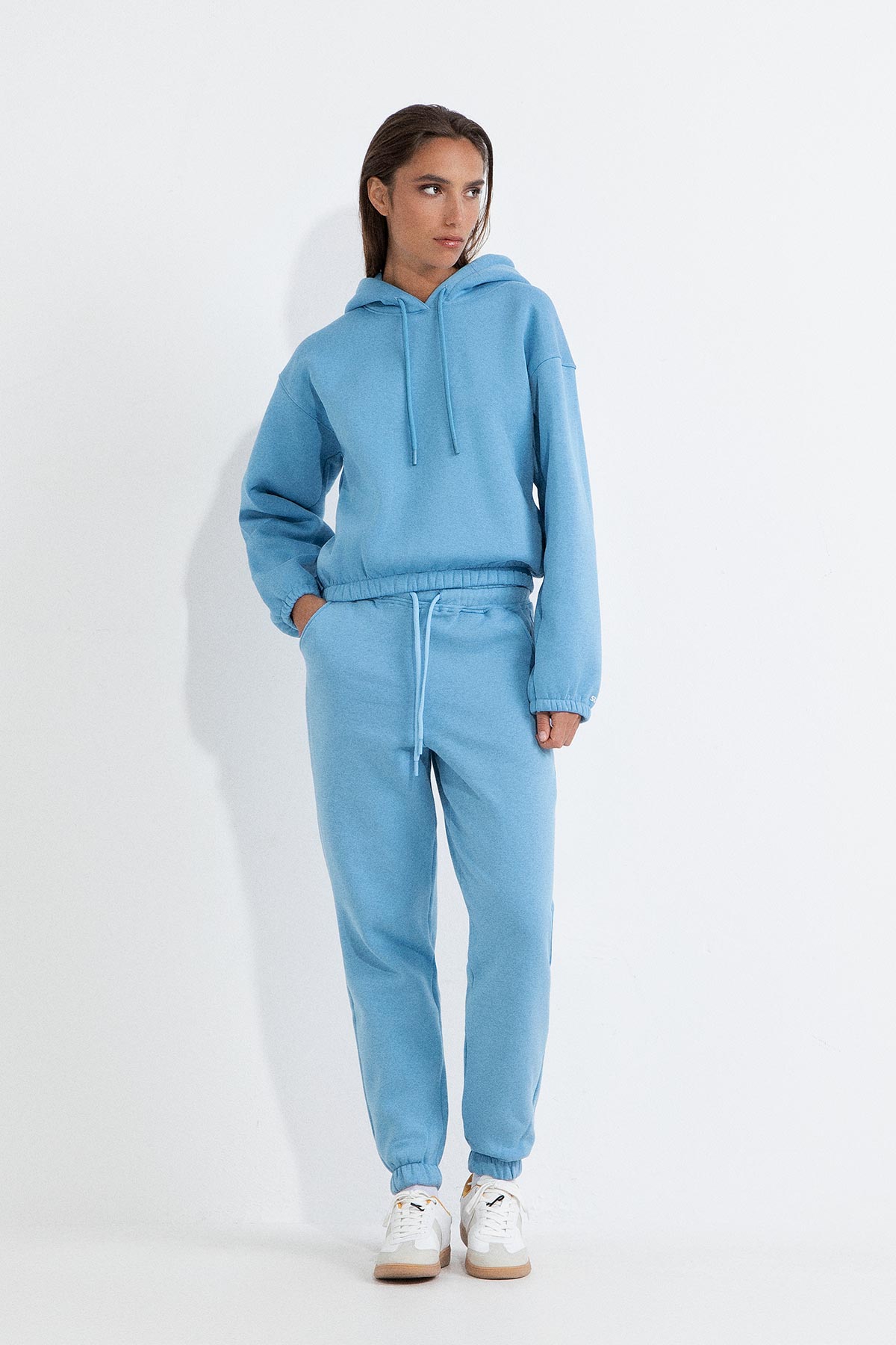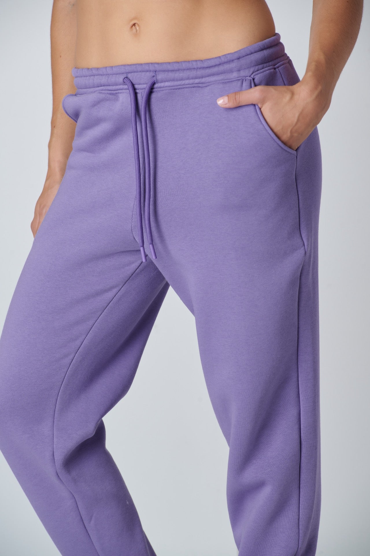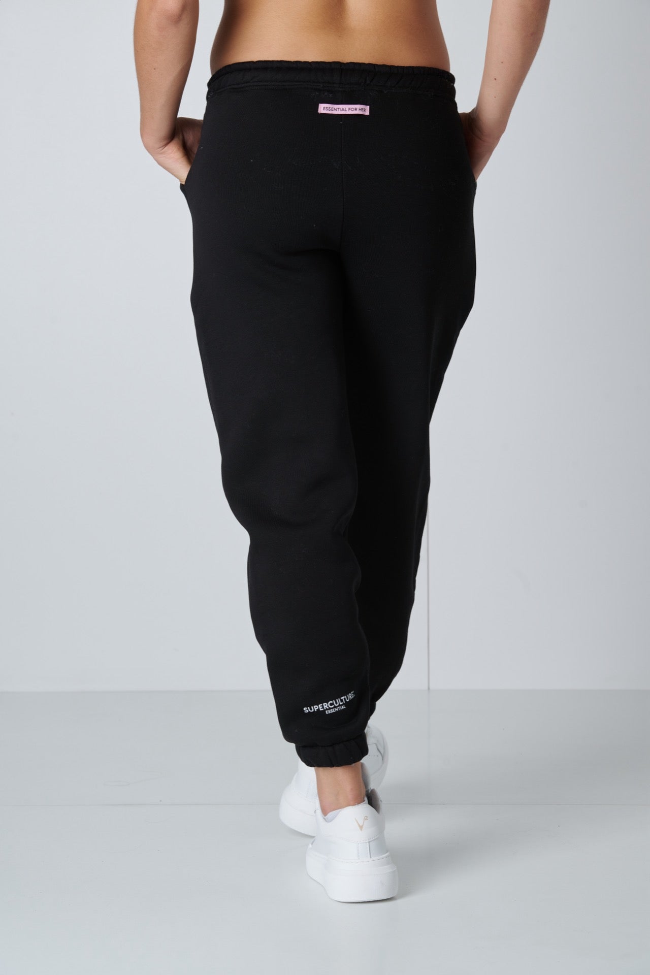 Pantalone in felpa con elastico in vita, due tasche laterali, tasca posteriore ed elastici alle caviglie.