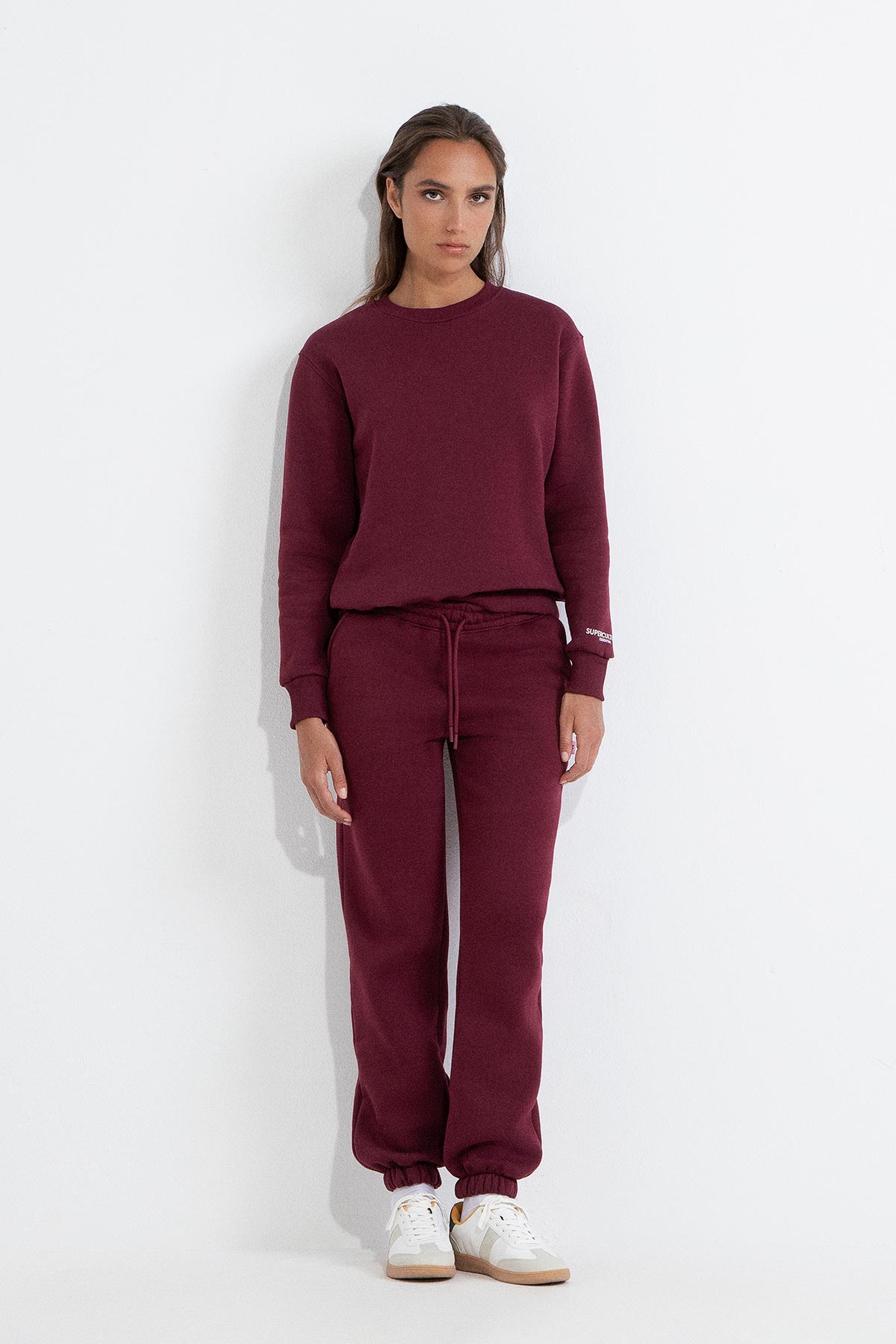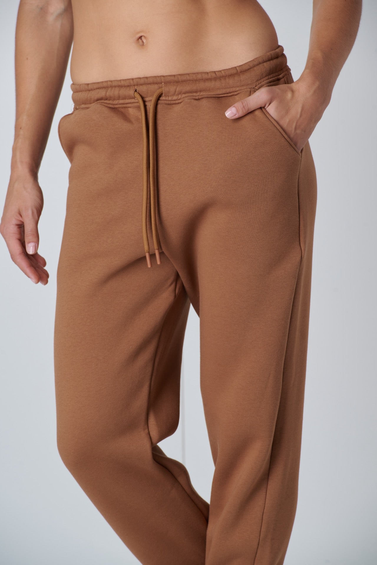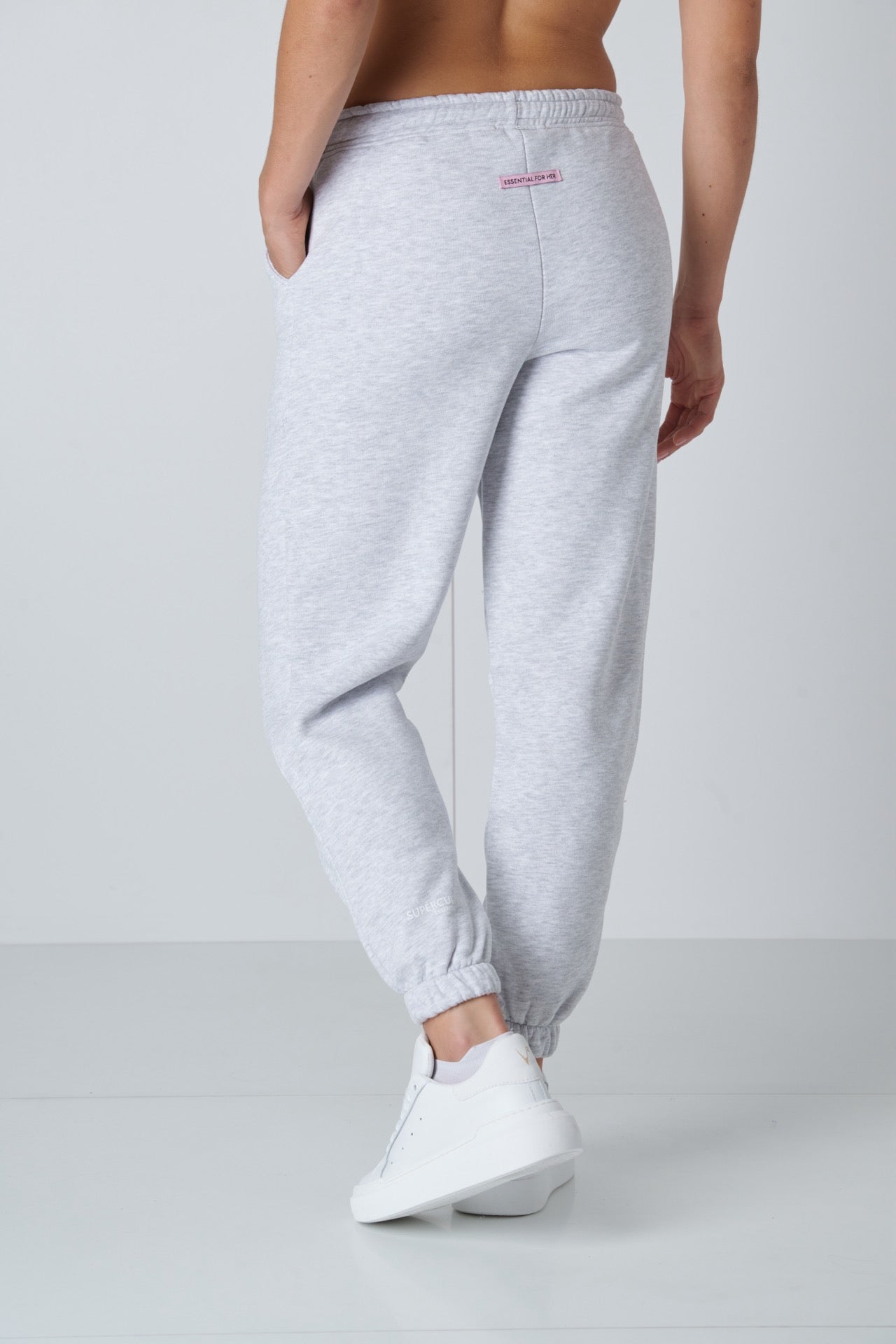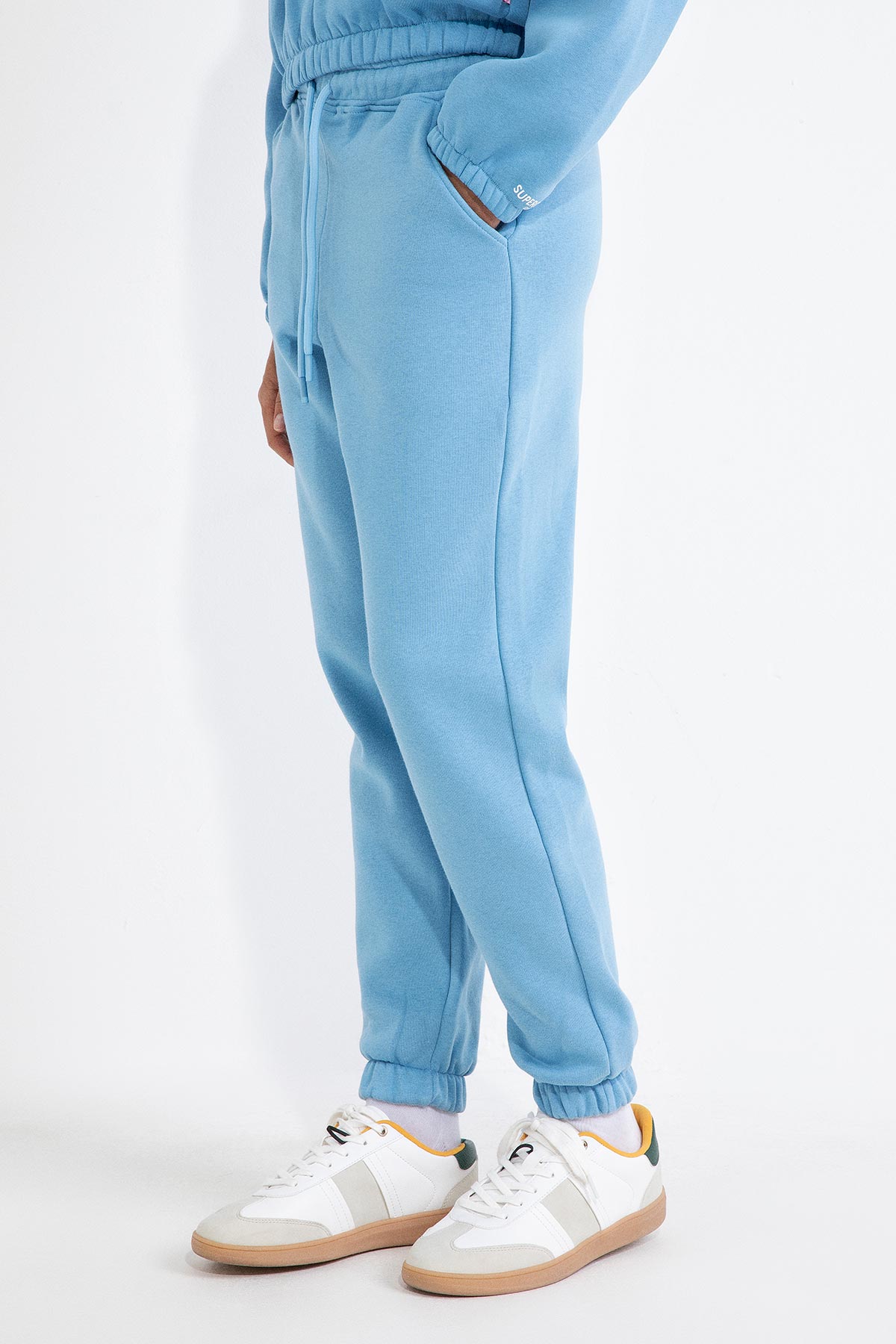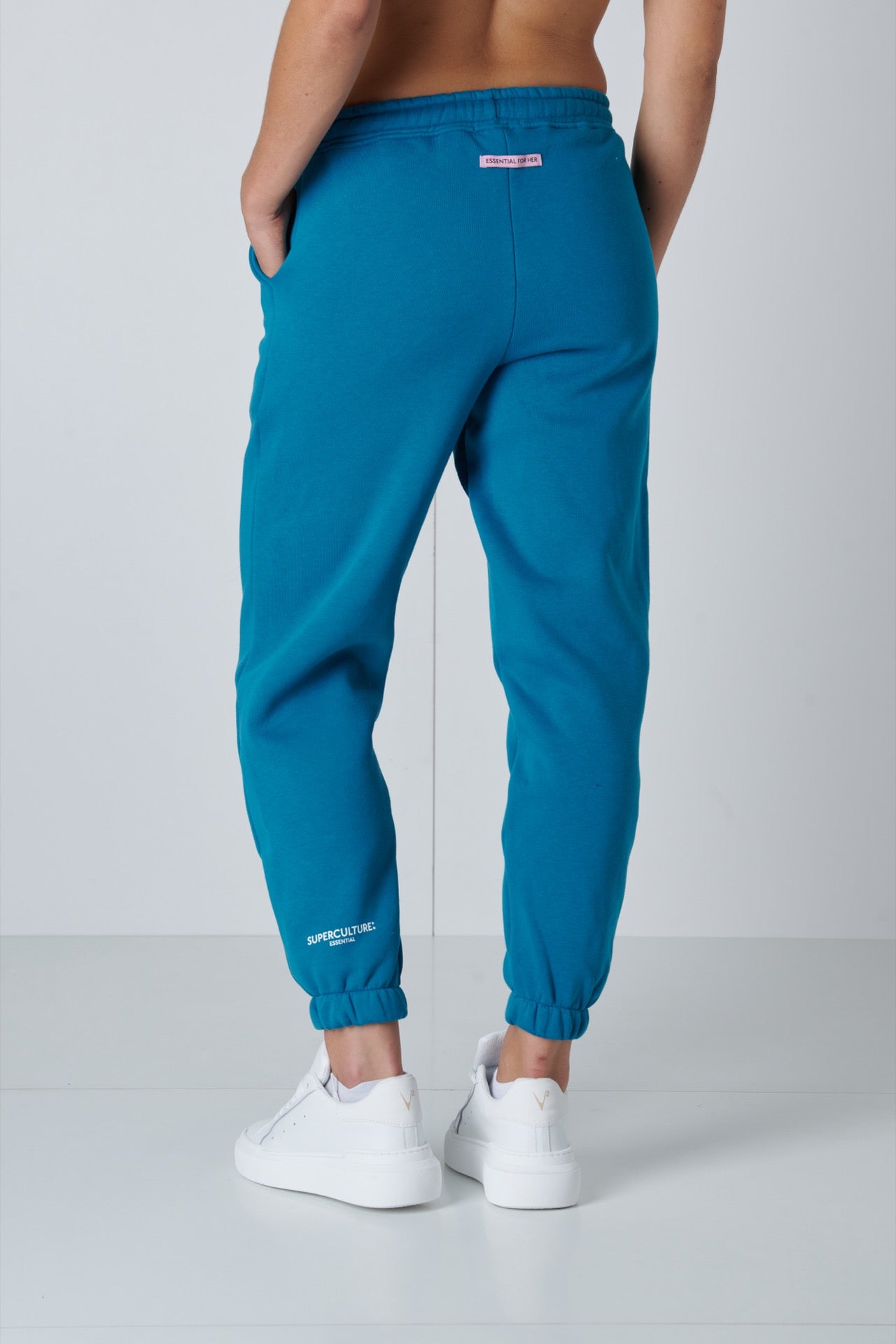 Pantalone in felpa con elastico in vita, due tasche laterali, tasca posteriore ed elastici alle caviglie.