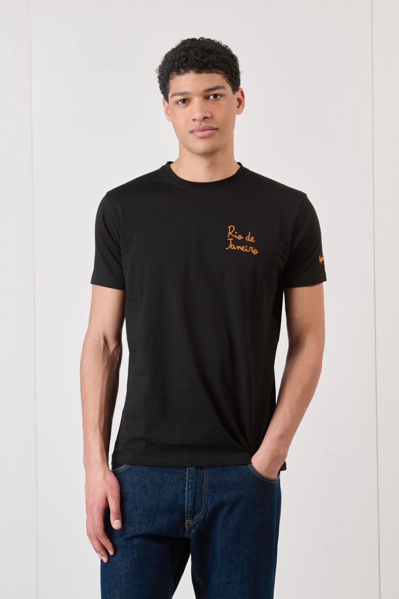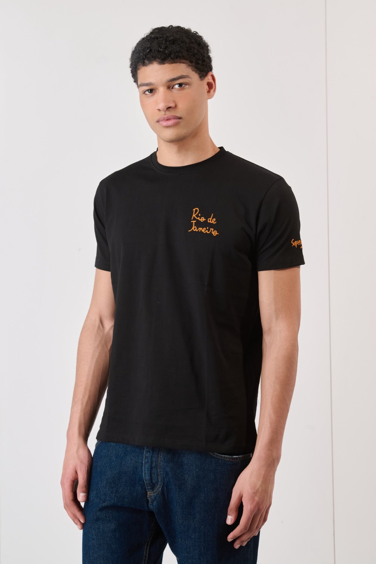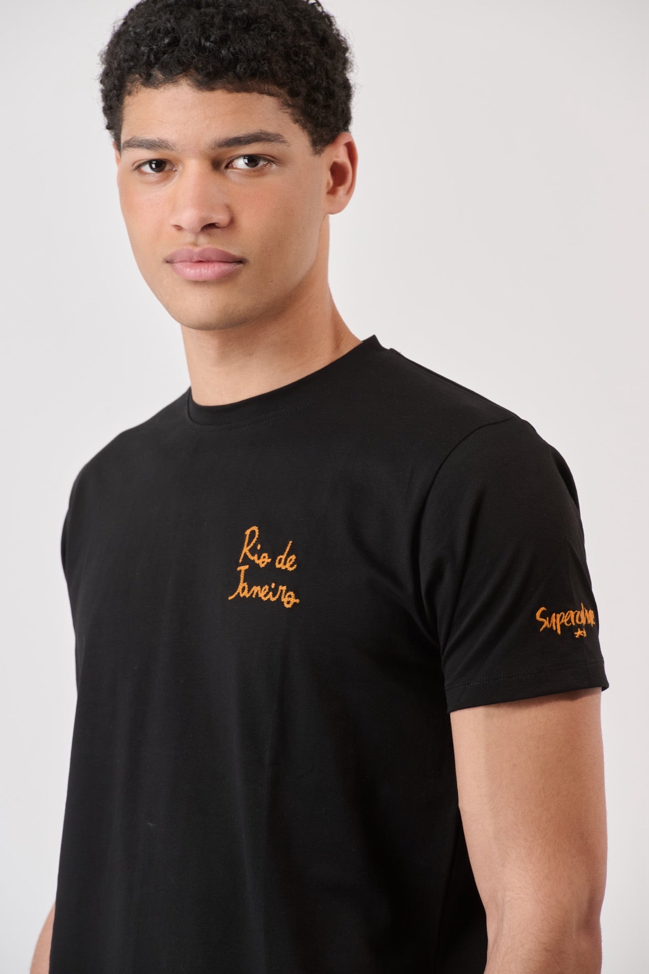 T-shirt Nera con ricamo frontale e stampa posteriore Rio De Janeiro