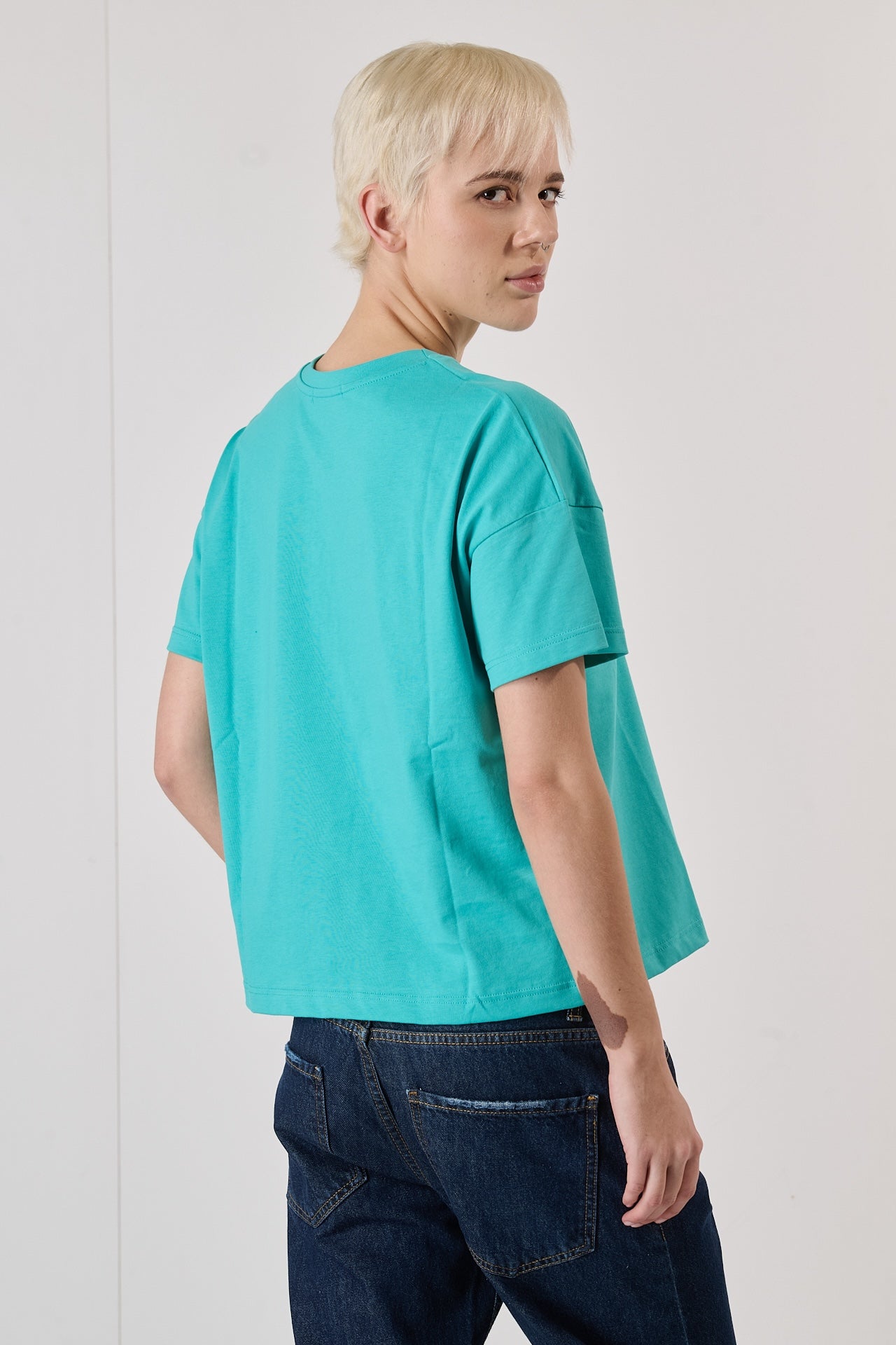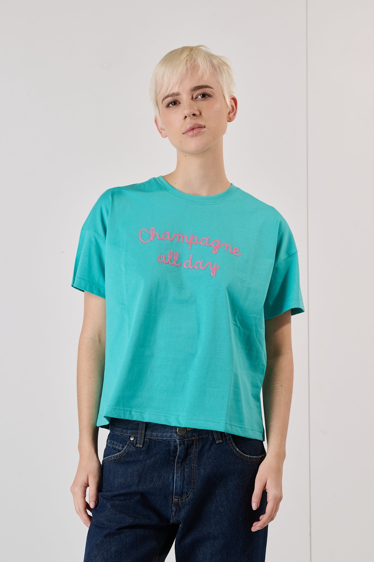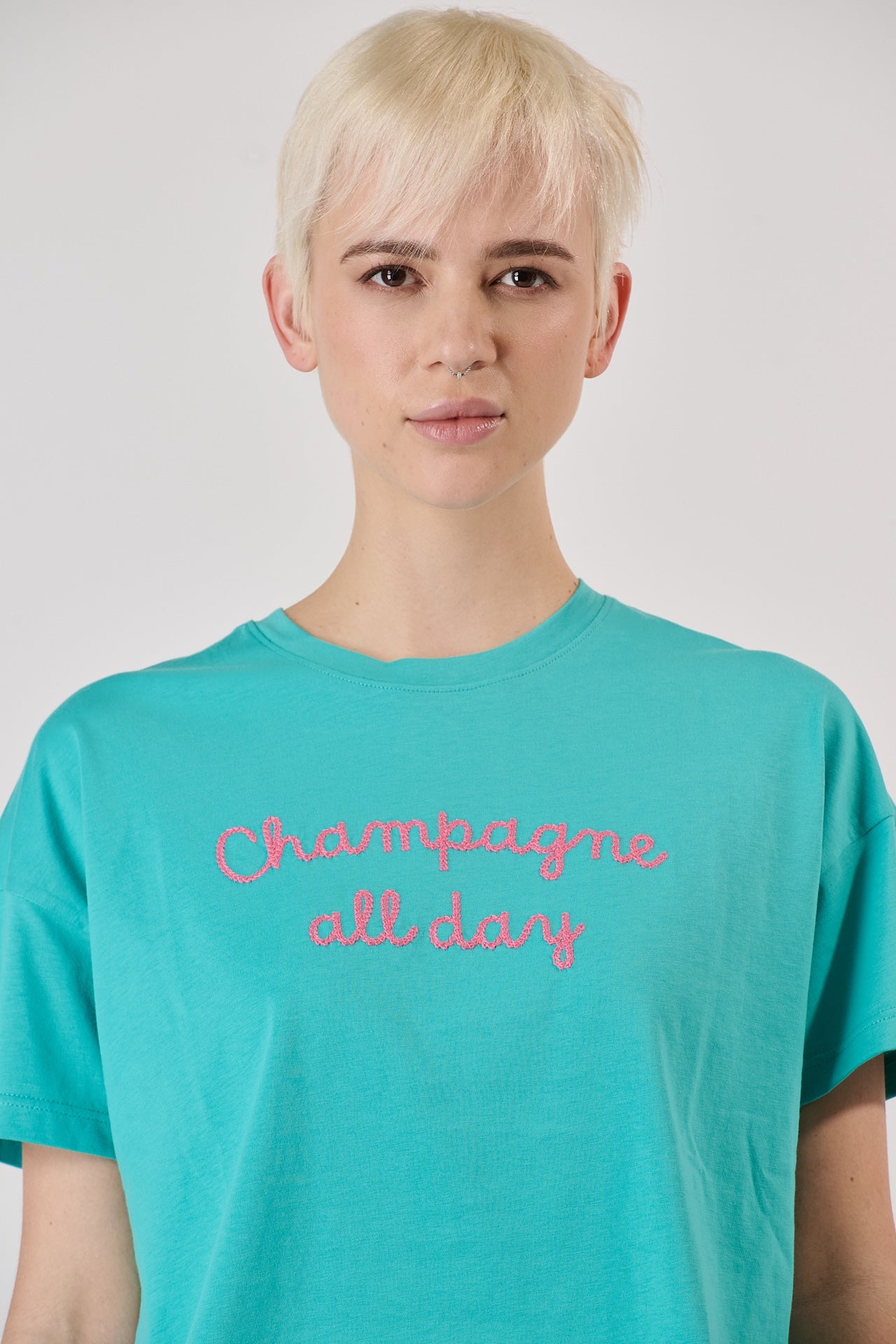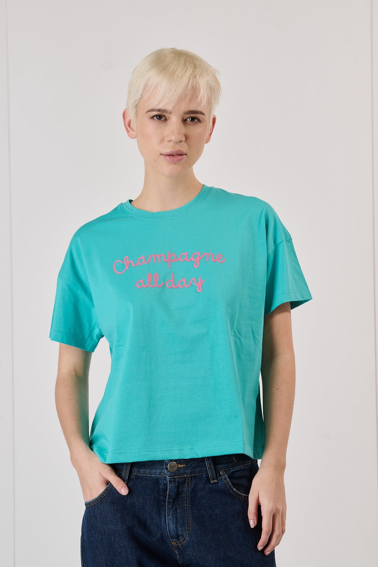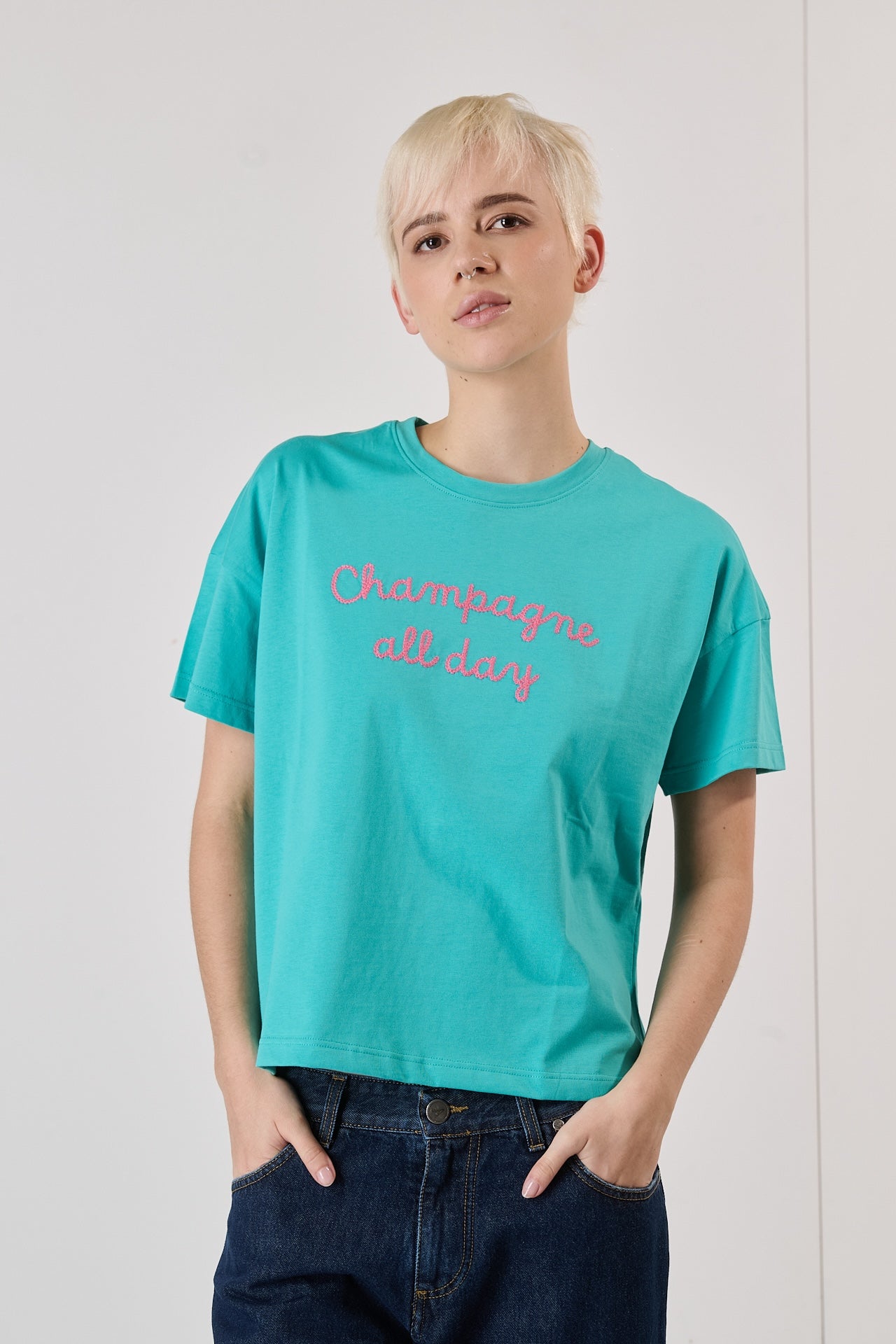 T-shirt Verde Acqua con Ricamo Champagne All Day