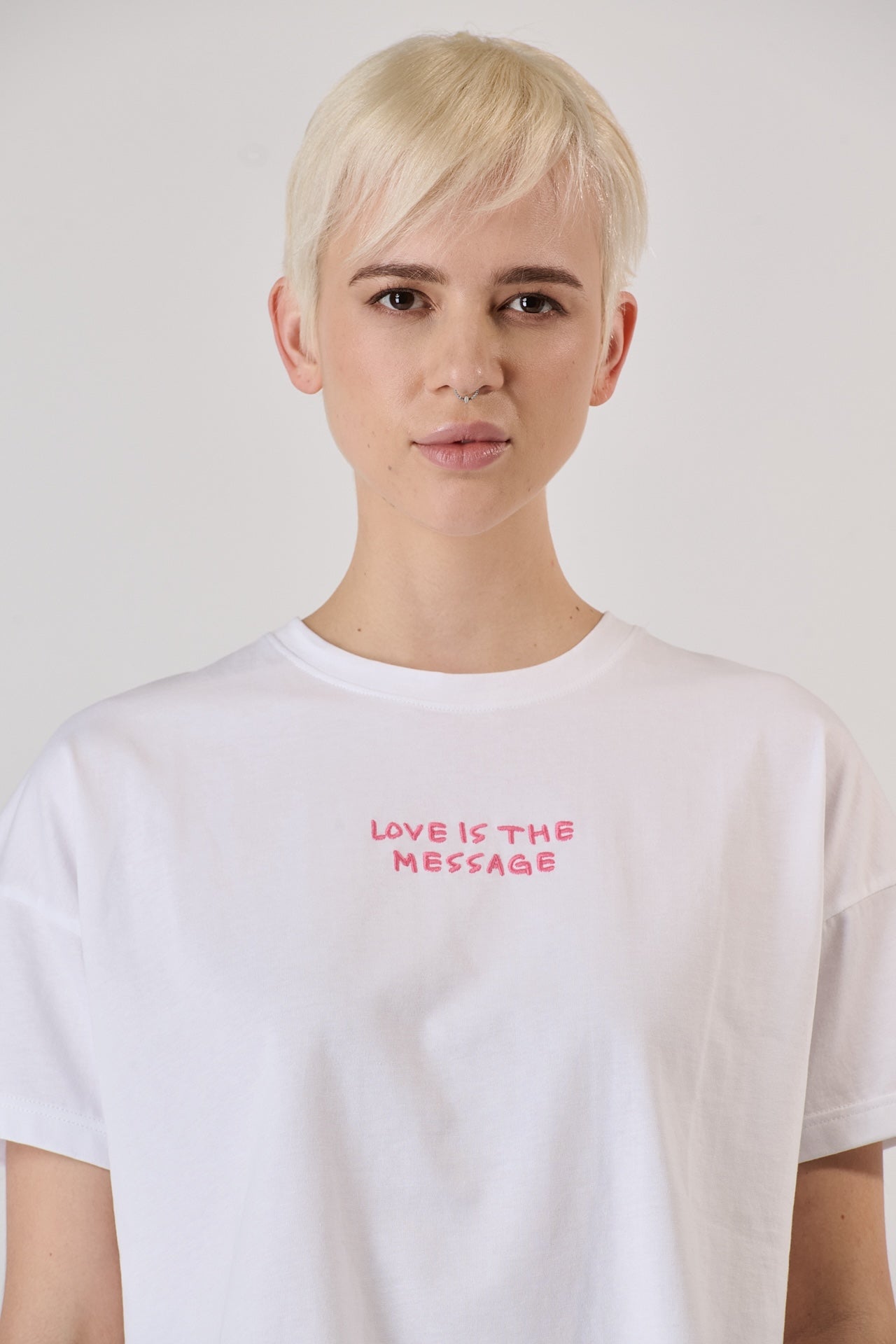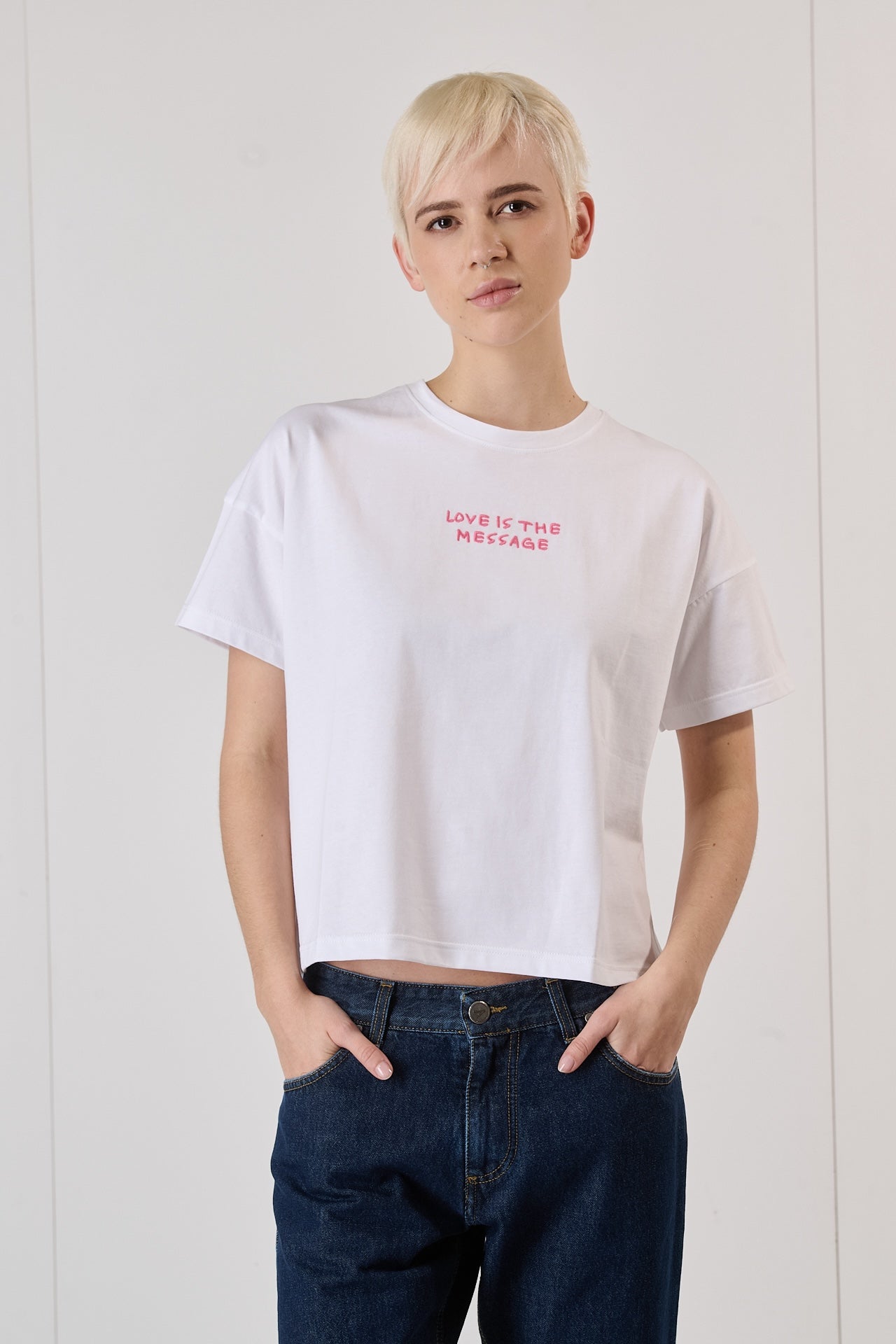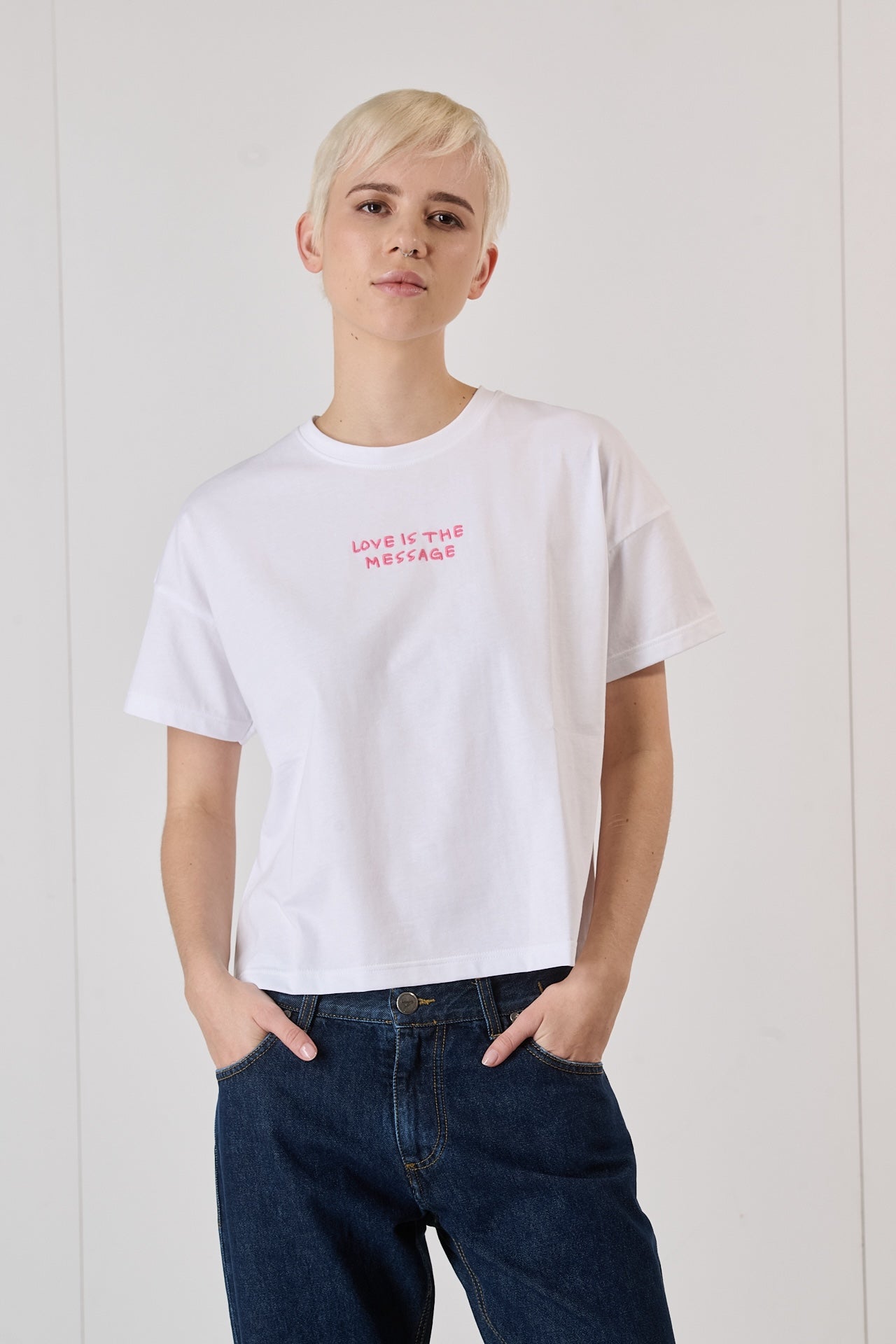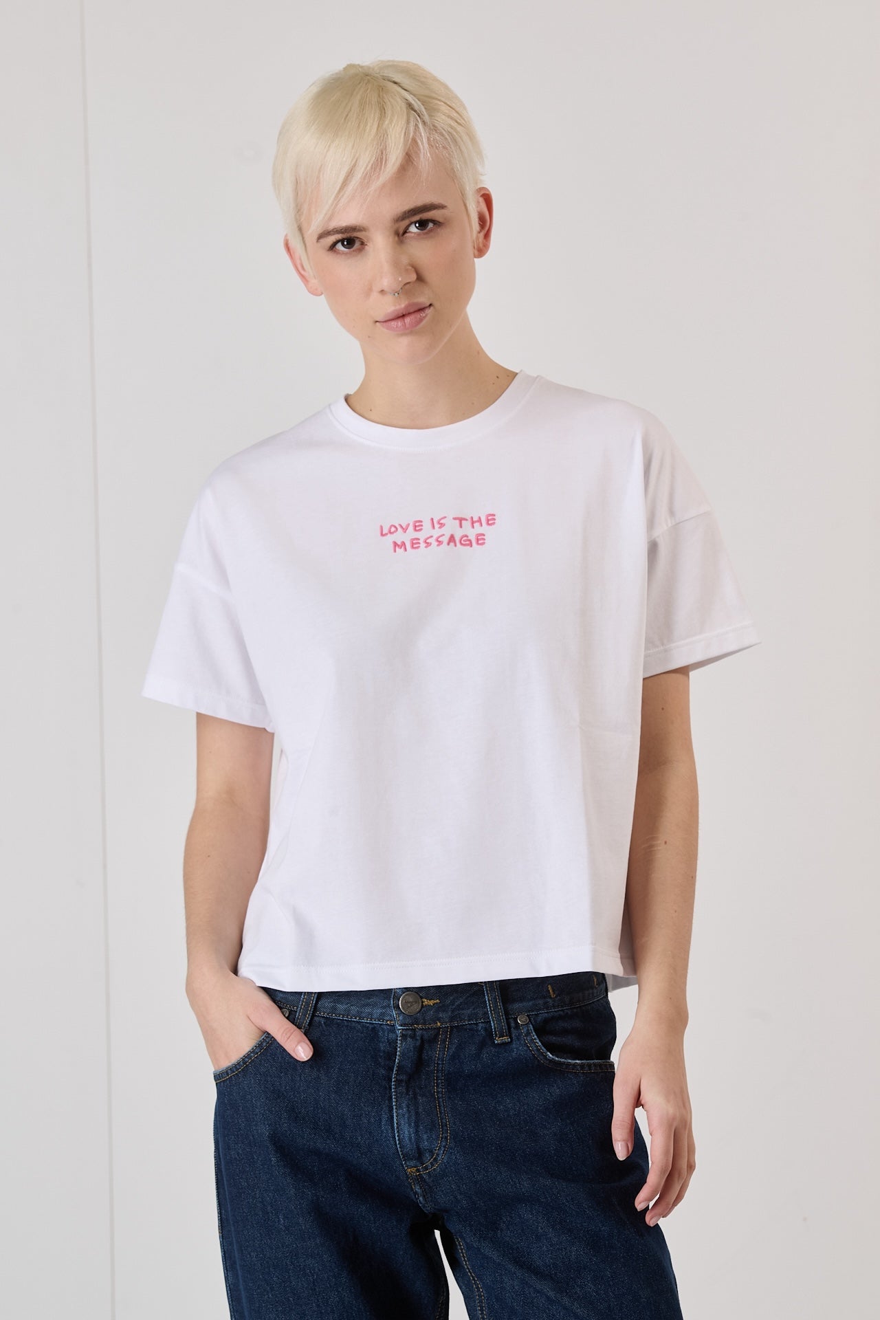 T-shirt Bianca con Ricamo Love is the Message